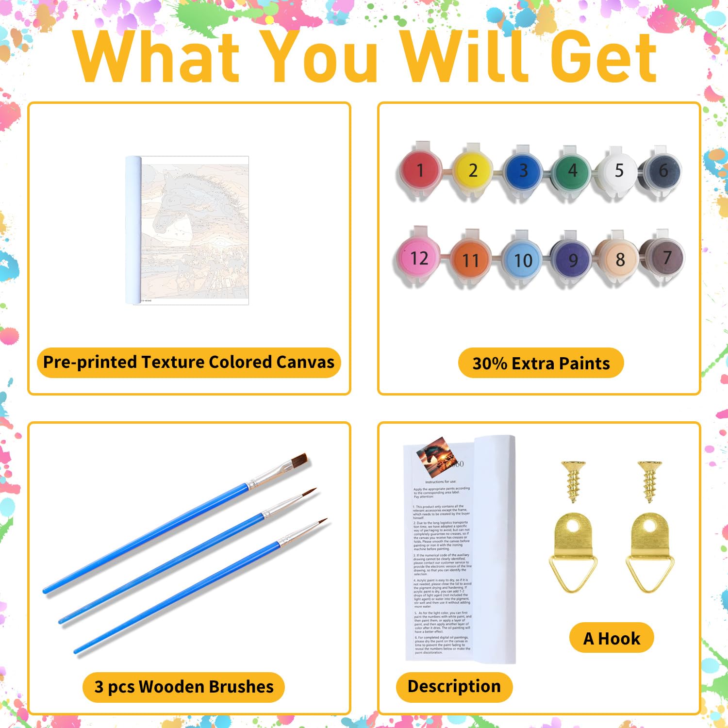 - 【What Will You Get ?】 Our horse paint by numbers kit for adults comes with everything you need to begin: 1x waterproof canvas, 1x matching paint, 3x nylon brushes (different sizes), 1x line drawing, 1x instruction manual, 1x finished effect card, 2x metal hooks.(No frame)