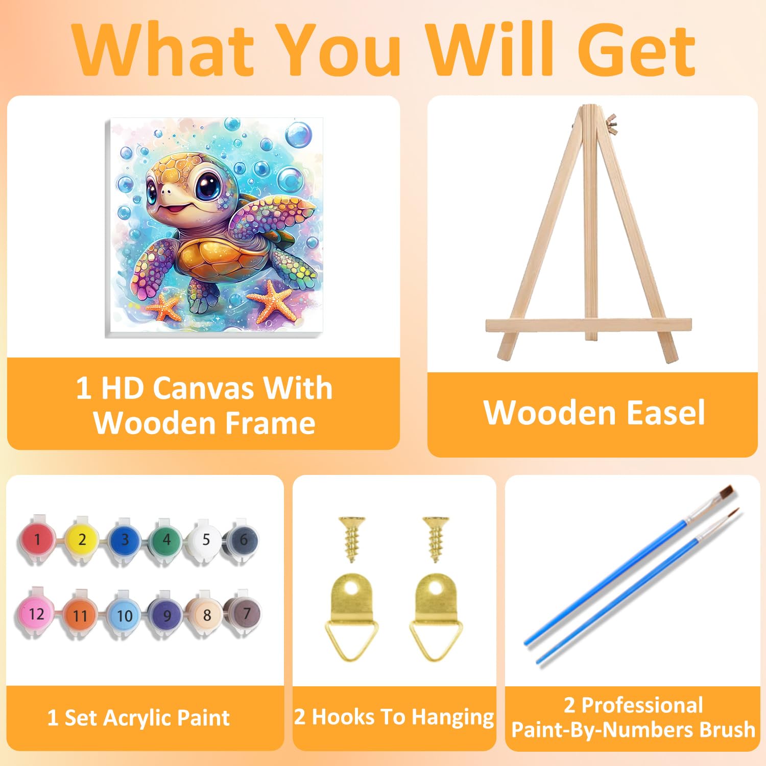 - 【What Will You Get ?】 Our turtle paint by numbers kit with frame for adults beginners comes with everything you need to begin: waterproof canvas with inner frame x1, matching paint x1, paint brushes x2 (different sizes), metal hooks x2, finished effect card x1, gift box packaging x1.(with frame and easel)