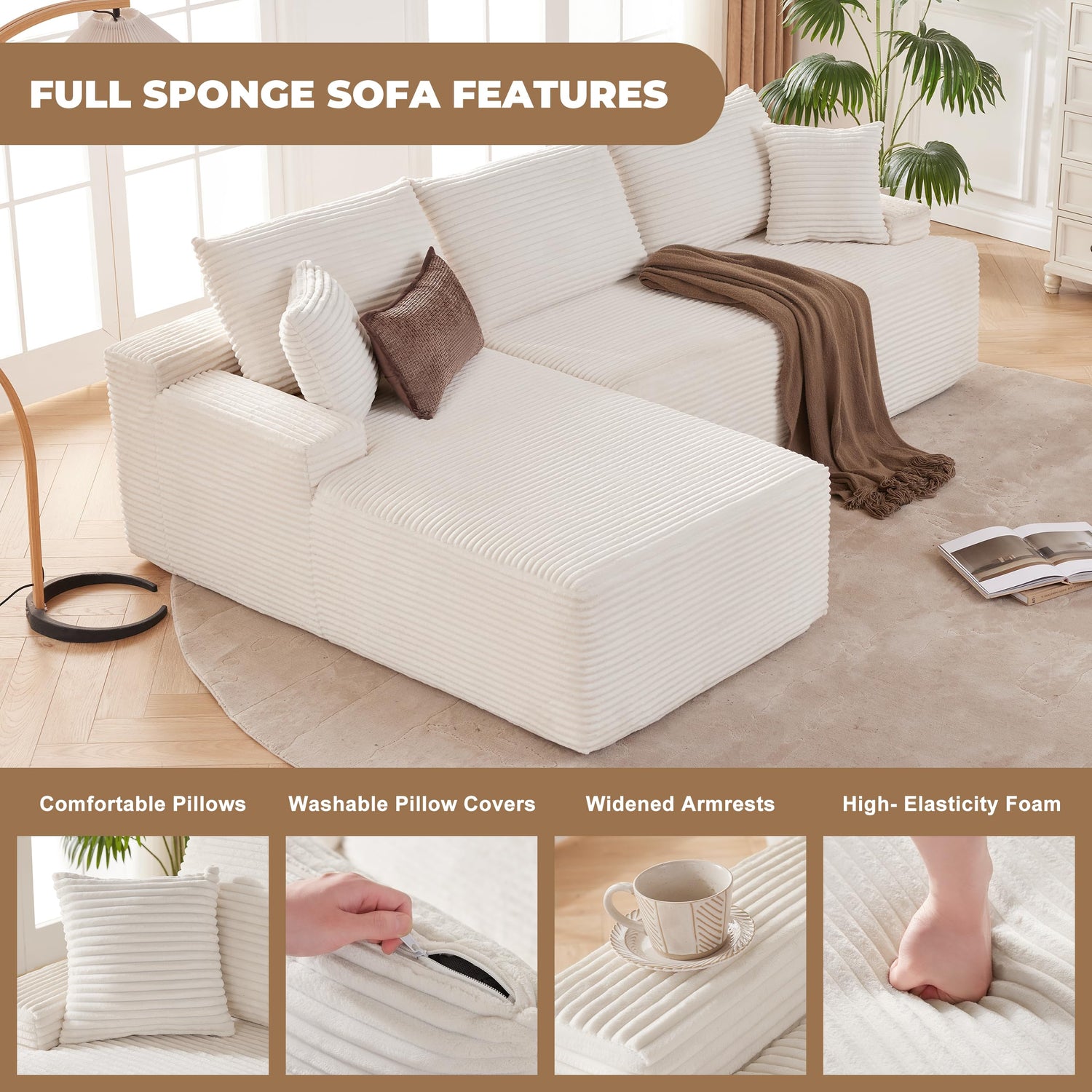 - Soft Corduroy Fabric: Upholstered in smooth, breathable corduroy, this Cloud Sectional Couch features an L-shaped chaise sofa design that blends comfort with quiet elegance. The fine ribbed texture adds visual warmth and provides a luxuriously soft, inviting seating experience