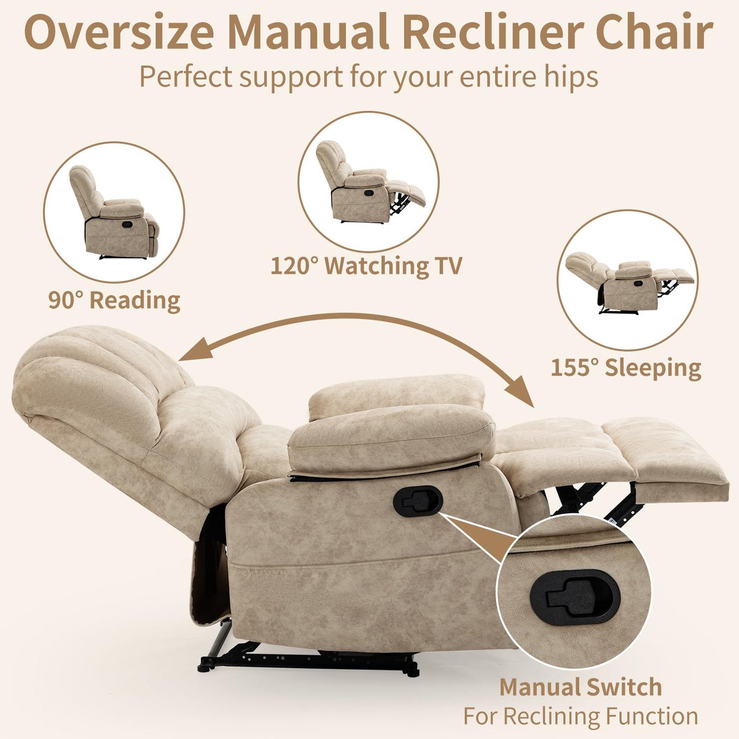 Manual Recliner Chair for Living Room, Single Sofa Recliners for Adults 350LBS, Heavy Duty Reclining Max 155 Degrees, Fabric Beige