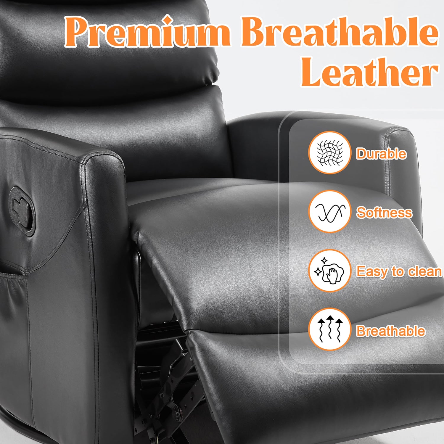 - [PREMIUM QUALITY] The swivel glider recliner is overstuffed with high-density sponge to provide you with great softness. The manual swivel rocking chair is upholstered with high-quality PU leather, which is durable and breathable, with a good texture. The metal frame base can hold up to 350lb, durable and secure enough to support an adult man.