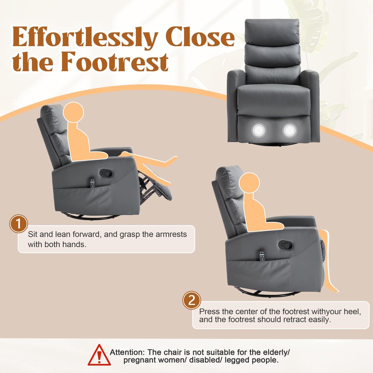 - [ATTENTION] 1. The swivel rocking chair is not suitable for the elderly, pregnant women, the disabled, and people with leg issues, as it requires a heel force to lower the footrest. 2. The manual swivel rocker recliner is packed in one box. 3. It does not have a lifting function.