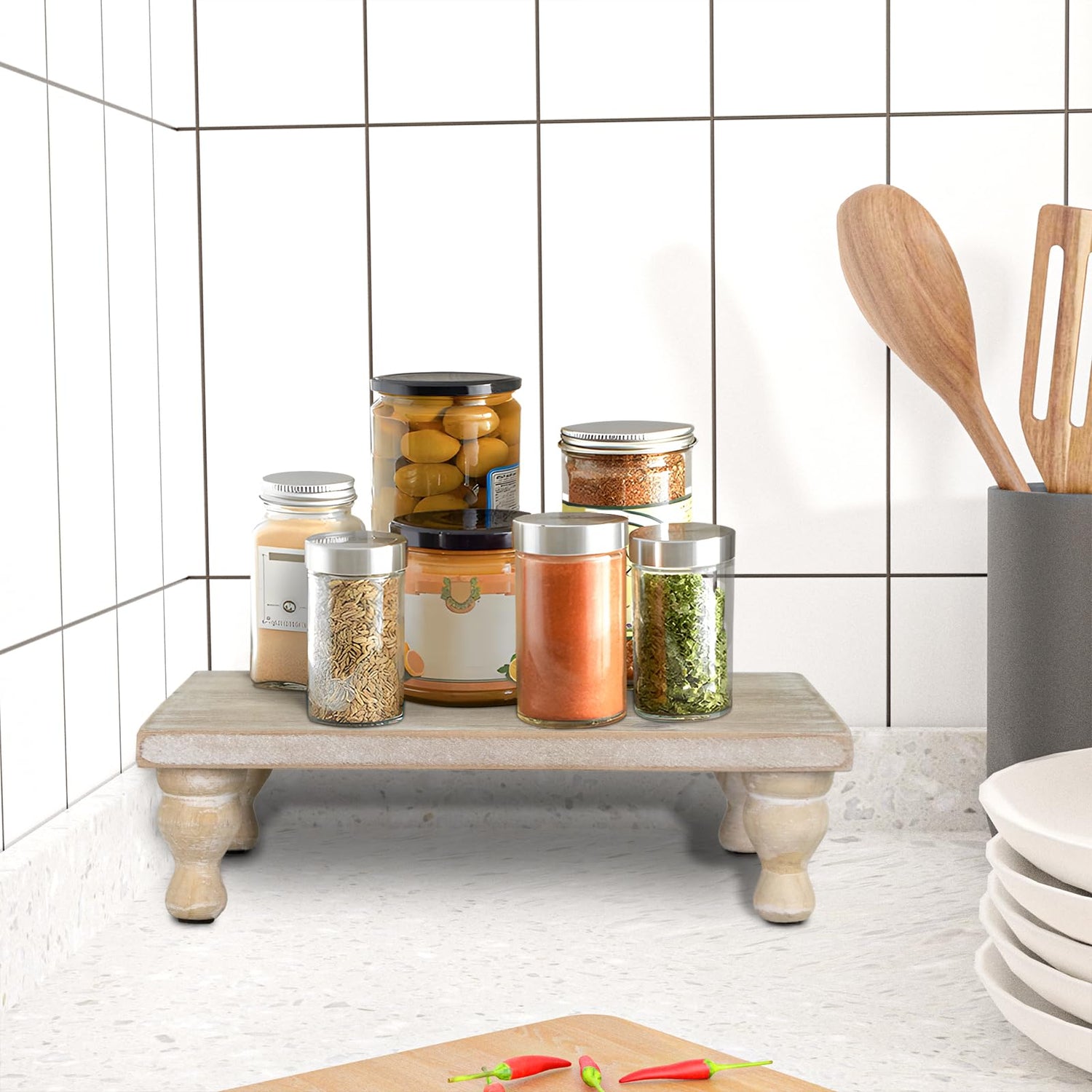 MAONAME Decorative Wooden Display Riser, Farmhouse Wood Pedestal Stand for Display, Rustic Washed White Tray Riser for Kitchen, Home Table Decor, Short and Tall Footed