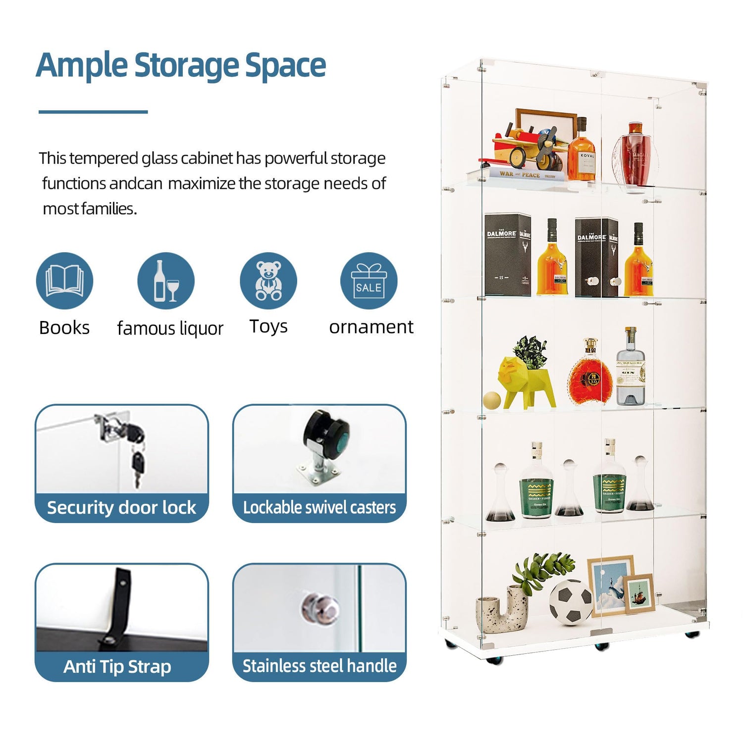 Maotifeys Modern Glass Display Cabinet 5-Shelf with LED Light, Lock and Wheels, 2 Door Curio Cabinets, Tempered Glass Collection Display Showcase for Living Room Home Office,White