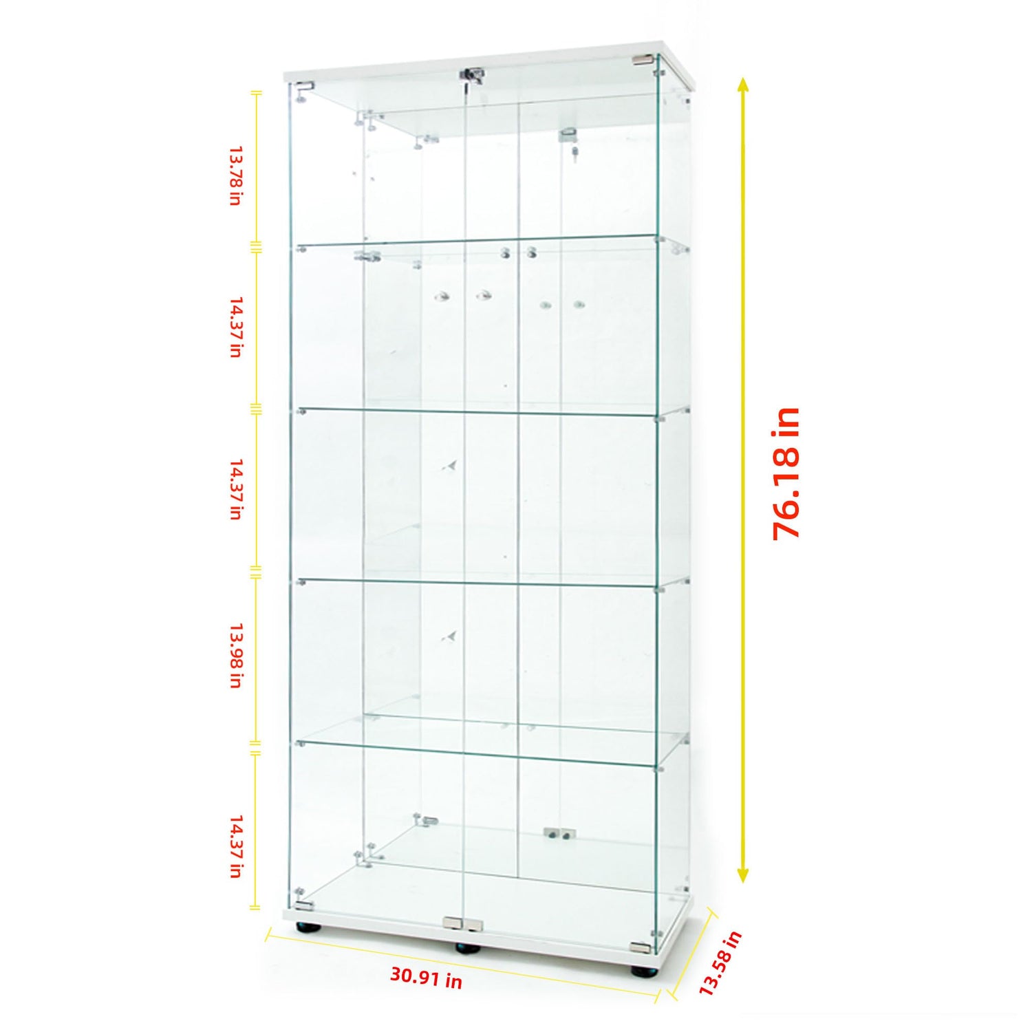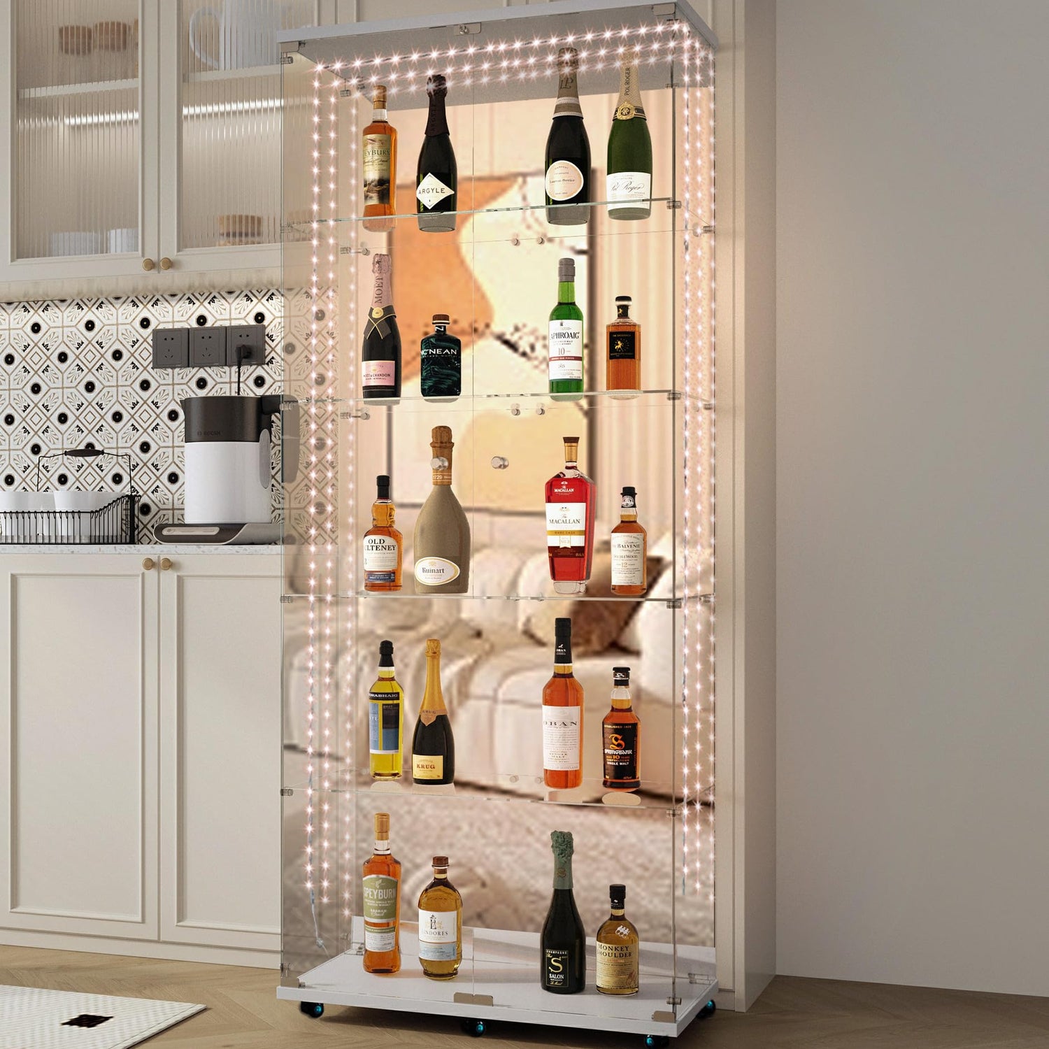 Maotifeys Modern Glass Display Cabinet 5-Shelf with LED Light,Mirror,Lock and Wheels,2 Door Curio Cabinets,Tempered Glass Collection Display Showcase for Living Room Home Office,30.9x13.5x74.8"H,White