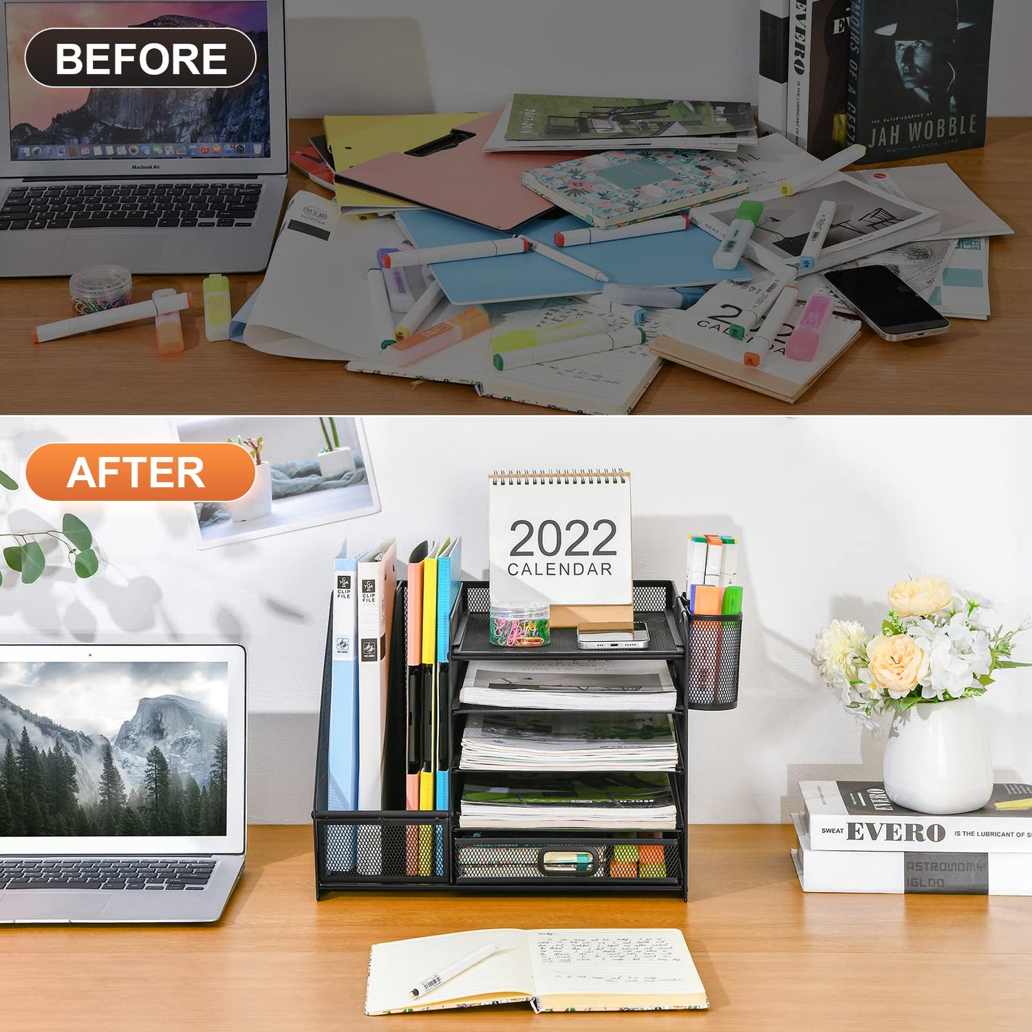 - 【Ideal Desk Organizer】Marbrasse newly releases the desk file organizer! The humanized office organization owns 5 sliding trays + 2 Magazine Holders + 2 Hanging Pencil Holders + 1 sliding drawer which tidies up your desktop and is convenient to your office! All the designs specialized to comply with your office, such a perfect supplies desk organizer must be the best choice for your office accessories
