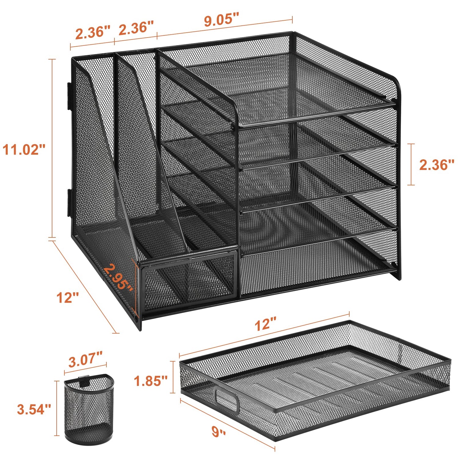 - 【Space Saving】All office document folders would be organized by the vertical file holder. The paper tray organizer is very suitable for storing books, magazines, letters, and A4 paper. The drawer organizer and hanging pen holder enough accommodate all office supply accessories, such as pens, pencils, scissors, and so on. Perfect Size: 13.8*11*12inch