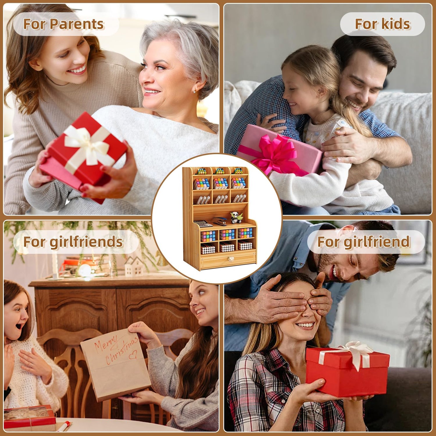 - 【STRONG & STURDY ORGANIZER】: Made of wooden board materials, sturdy construct, safe and nontoxic. Assembled chimeric design, strong and durable. Superb craftsmanship with specially varnished for glossy surface, excellent touch feeling and funny DIY design makes it be a perfect gift choice. The desktop organizer shelf is easy to clean and can protect from dust and water.