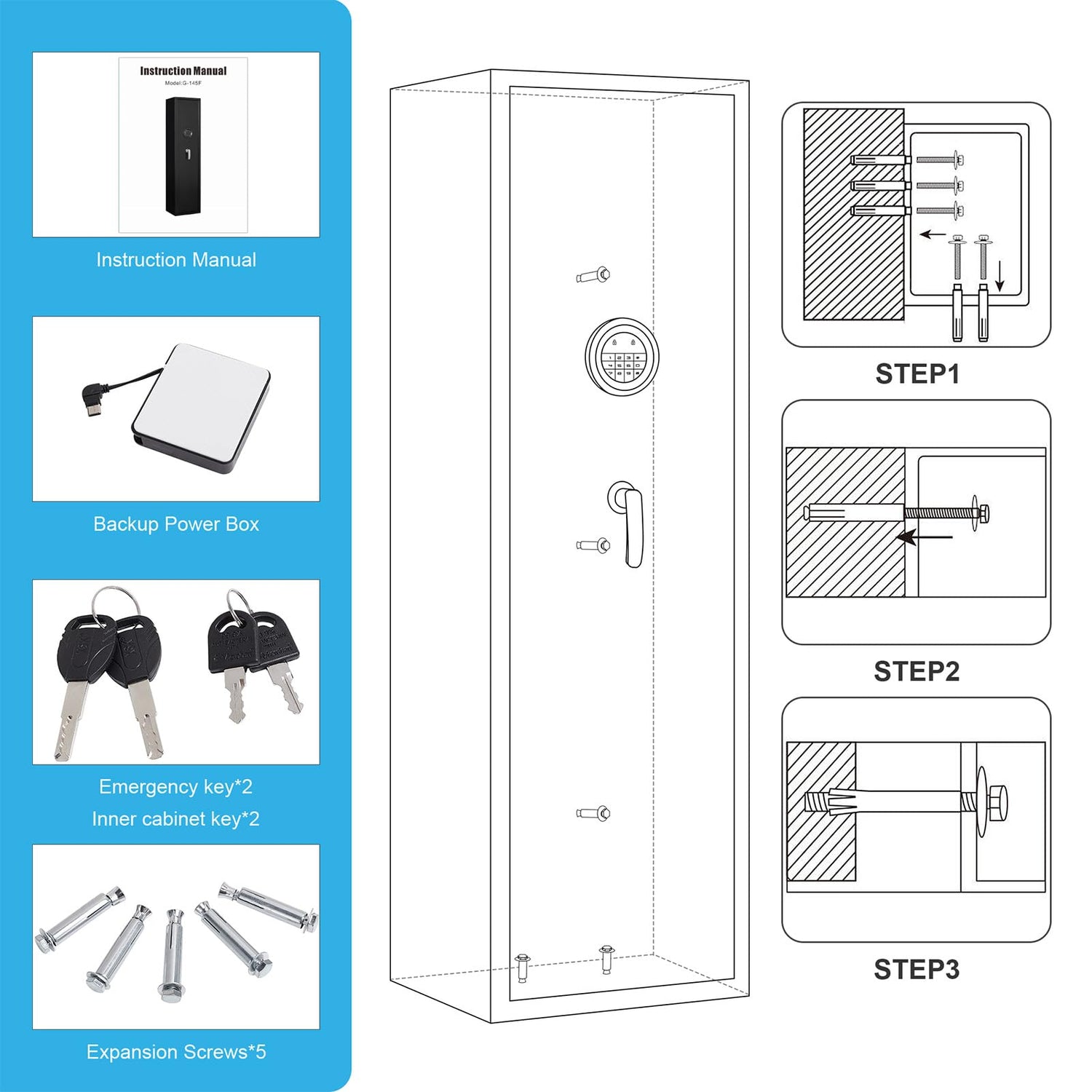 - 【Accessories and After-Sales Service】2 Rifle Cabinet Keys, 2 Built-in Cabinet Keys, 5 Expansion Bolts, 1 Manual, 1 Emergency Charging Cable.We Have 24/7 Customer Service, You Can Contact us Anytime If You Have Any Questions.