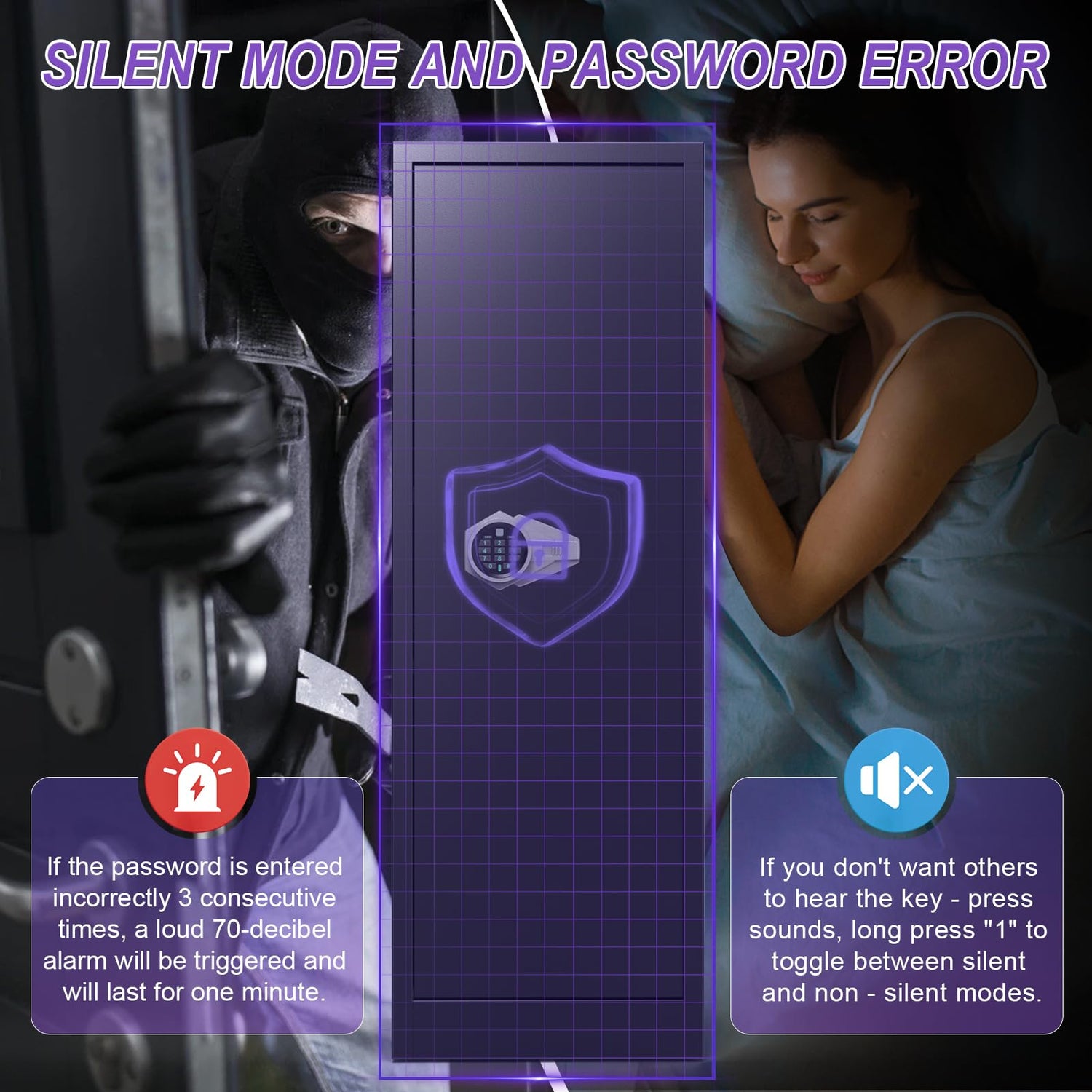 - 【Military-Grade Protection, Maximum Security】: Crafted from advanced alloy steel, this rifle gun safe features 3 thickened solid locking bolts and an anti-pry design for unrivaled durability. As a top-tier home gun safe, it's equipped with an intelligent alarm system: 3 incorrect password attempts trigger a 70dB alert, safeguarding all firearms stored inside. Ideal for rifles and shotguns, our gun cabinets ensure maximum security against unauthorized access