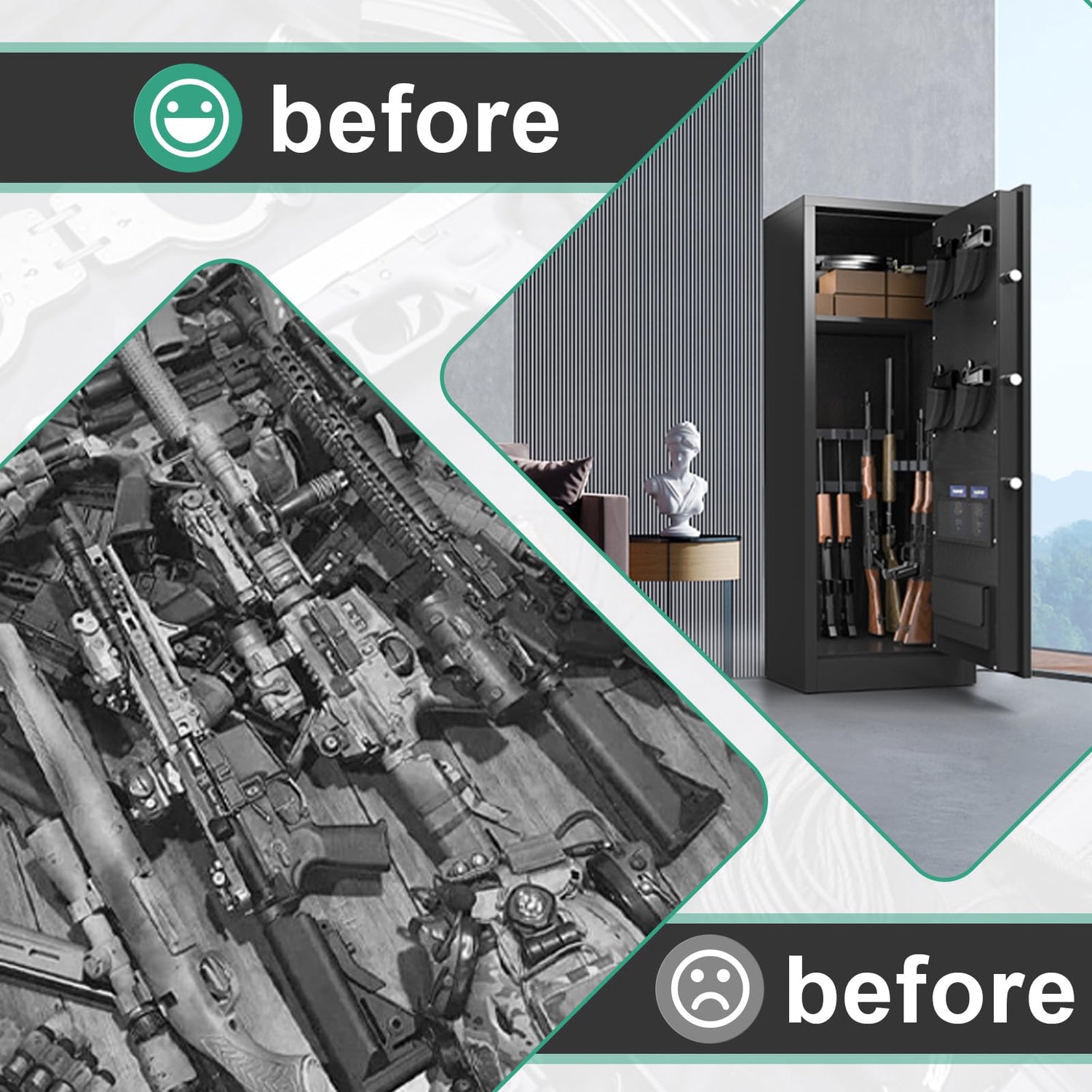 - 【Dual Alarm System】 This rifle safe is equipped with the most advanced alarm system. In addition to the automatic alarm that will sound immediately after three incorrect passwords are entered, the gun safe for rifles will also automatically sound an alarm when it is violently hit or shaken after the vibration alarm is turned on. This intelligent protection system notifies you and your family that a potential intruder is attempting to access your gun locker, raising the alarm and ensuring the safety of your property and home.