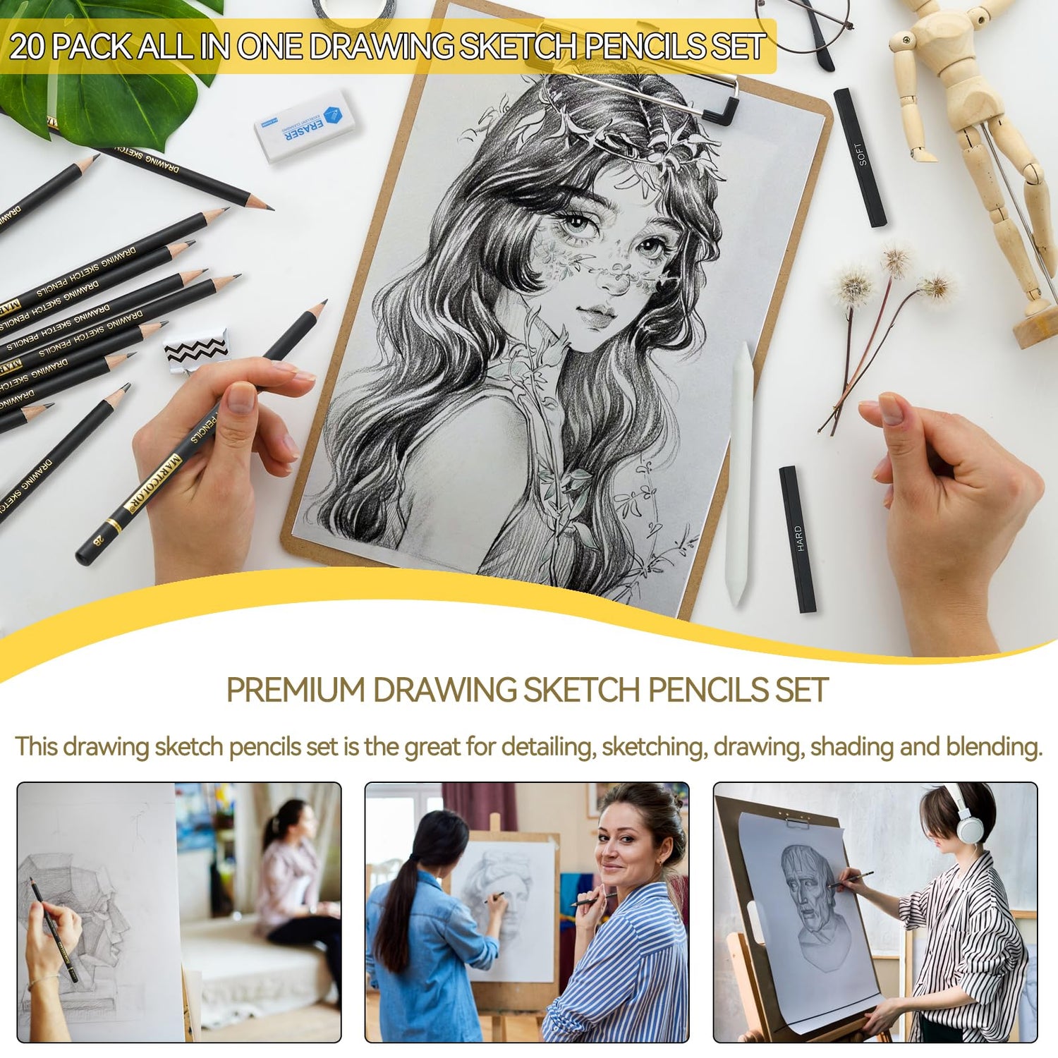 MARTCOLOR Drawing Sketching Pencil Set, 20 Pieces, Graphite Pencils (14B-4H), Charcoal Sticks, Stump, Eraser, Sharpeners, Ideal for Drawing Art, Sketching, Artist Pencils for Beginners & Pro Artists