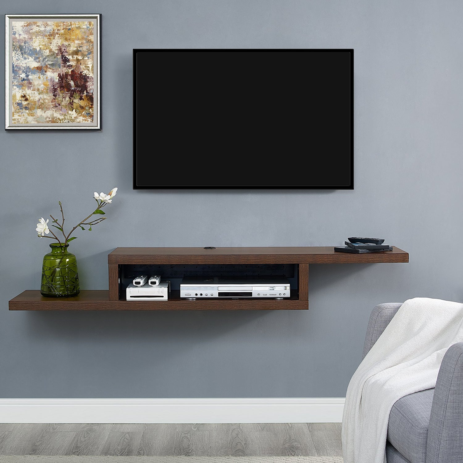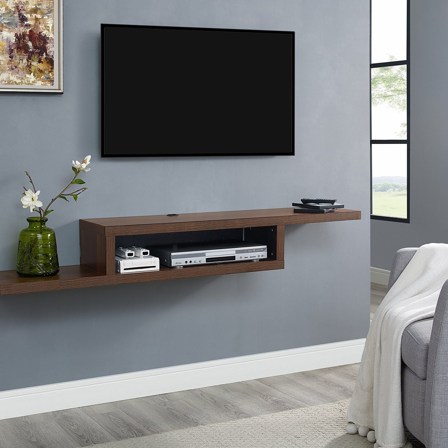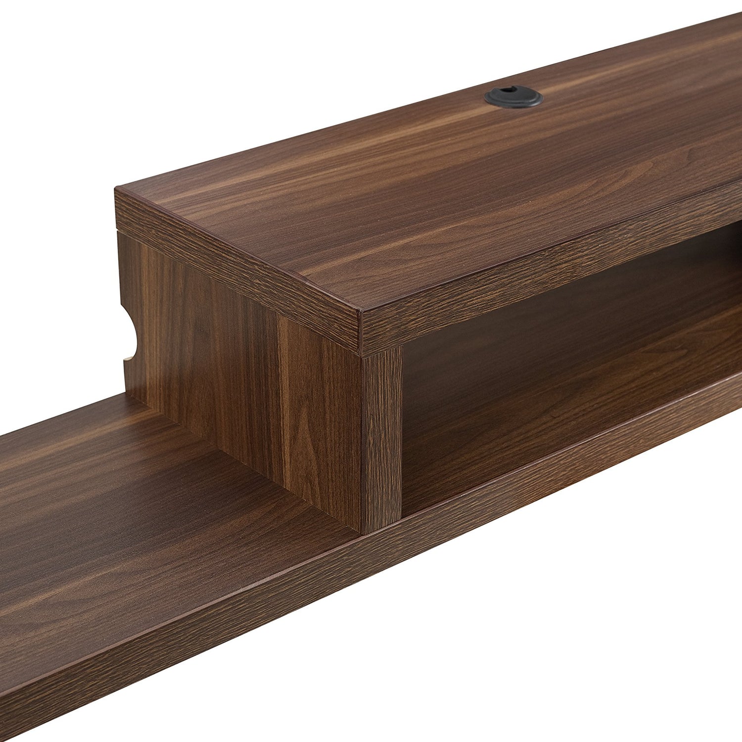 Details: The colonel 60" wall mount TV console has a modern flair with the appearance of a floating shelf and a unique asymmetrical design. Finished in a Columbian Walnut laminated wood tone with black accents, this bold design is functional and visually striking. The shelf is designed to hold 1 audio/video component along with a sound bar in the top shelf. It holds up to 70 lbs. And comes with Mounting hardware for standard wood stud wall installation. The wall mounted console boasts concealed wire management and assembles in minutes. Backed with a 5 year warranty.