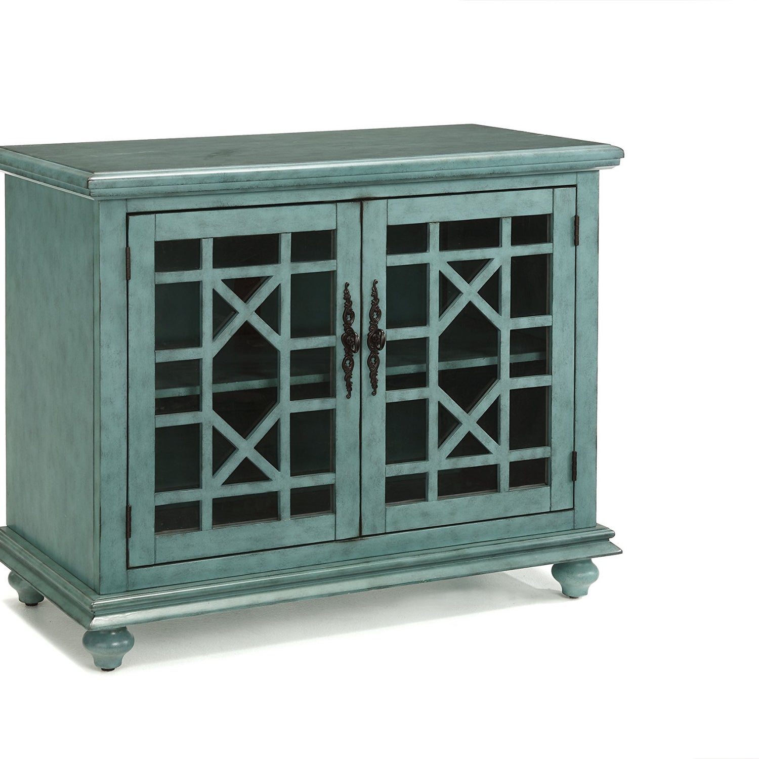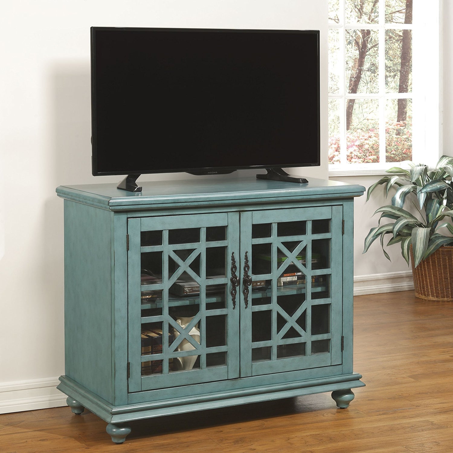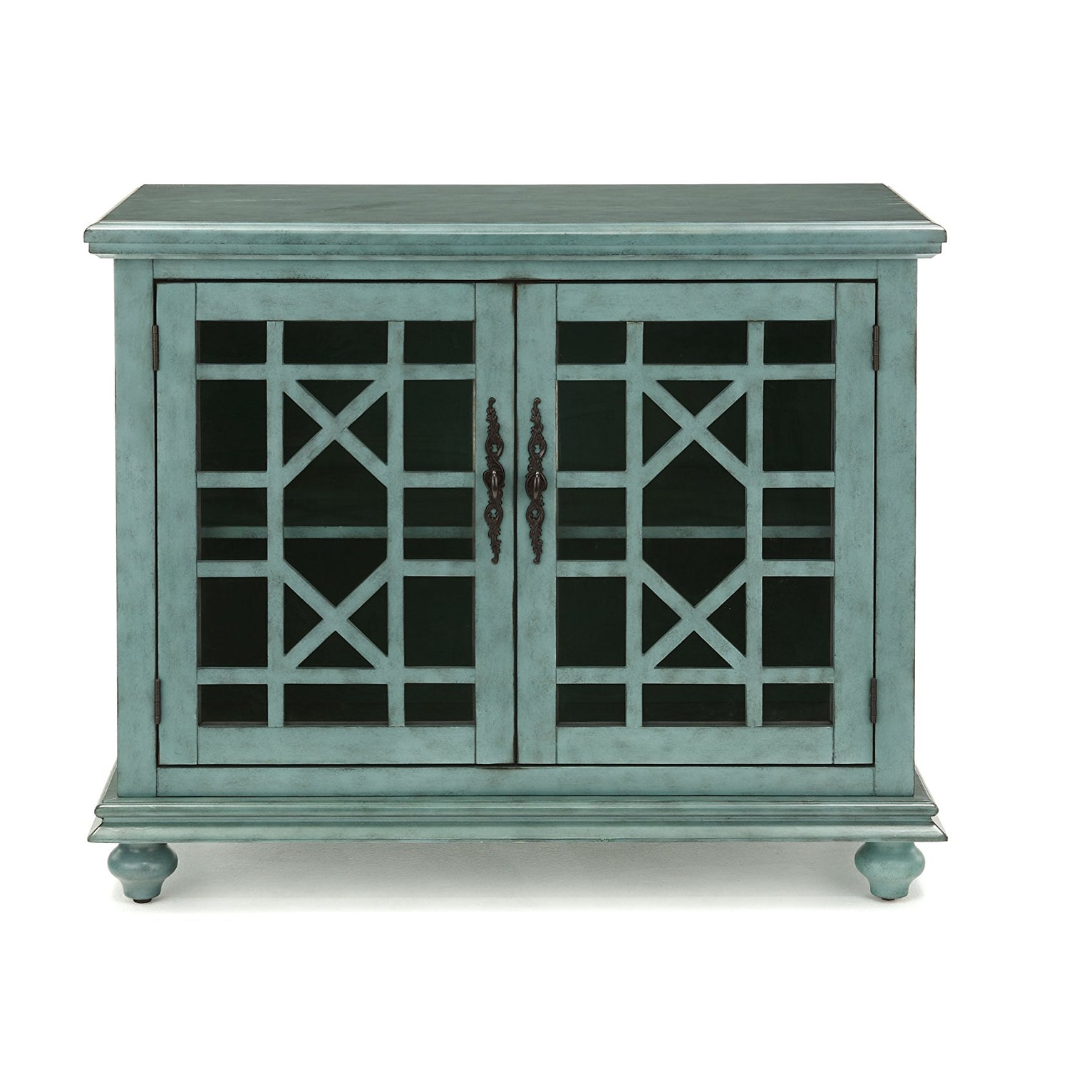 The Elegant Small Spaces collection is designed for with functionality in mind to be used as an occasional or accent cabinet in any room in the home or as a TV Stand. This piece features a beautiful Teal painted finish with sophisticated transitional styling inspired by design cues taken from Parisian antique markets. Elegant trellis details on the two glass doors, intricately cast door pulls, turned bun feet, and architectural moldings are all blended together for an exquisite look. Each piece is slightly distressed with just the right amount of rub through at the edges to make it seem like this was a piece handed down through generations. Features the Lightning Fast Assembly System which allows for assembly in under 10 minutes. One large removable and adjustable shelf provides versatile storage options for TV components, games, books, and other belongings . Vertical wire management cutouts allow for easy access with multiple shelf configurations. Ideal for TVs up to 42 inches. Anti-tip kit added for safety. Assembled Dimensions: 38" W x 32" H x 18" D. Product Materials: MDF, Acacia wood, Glass.