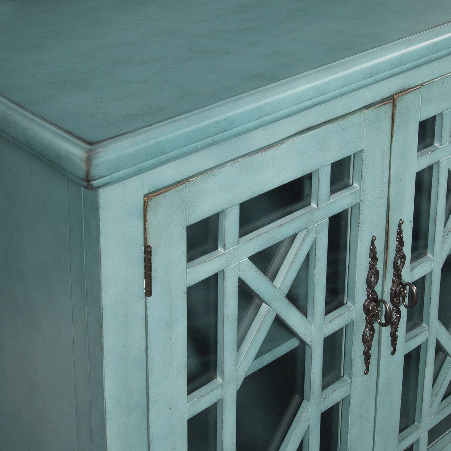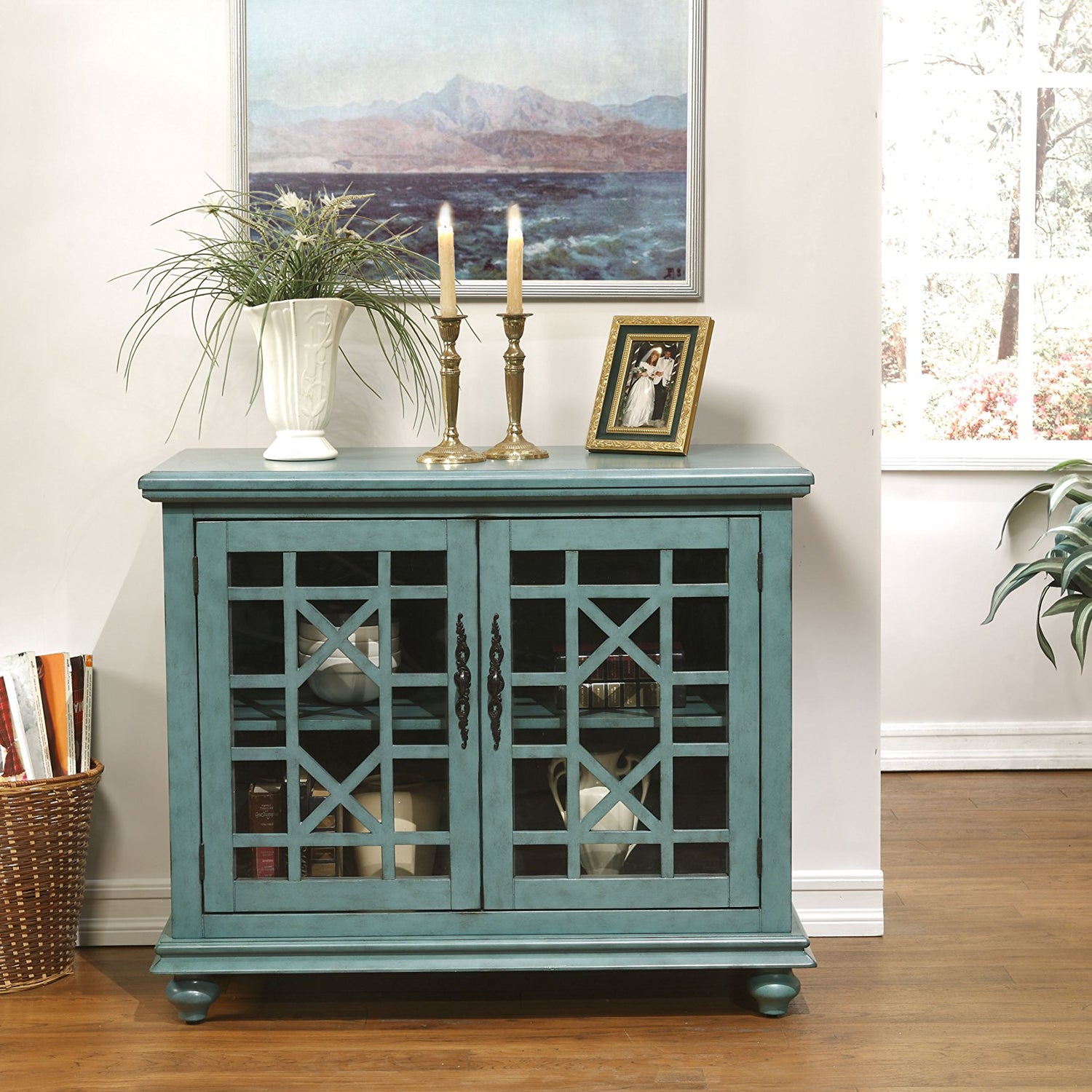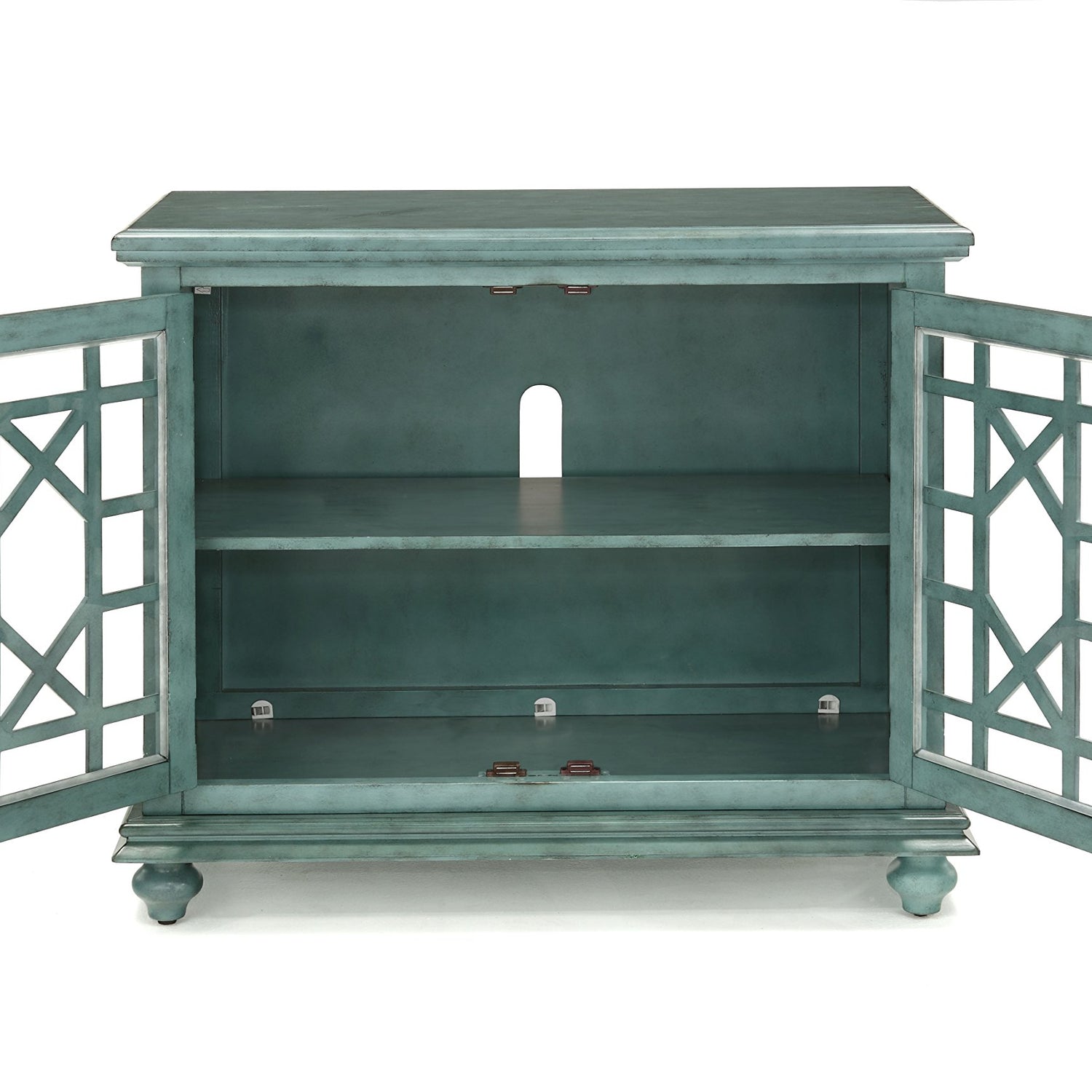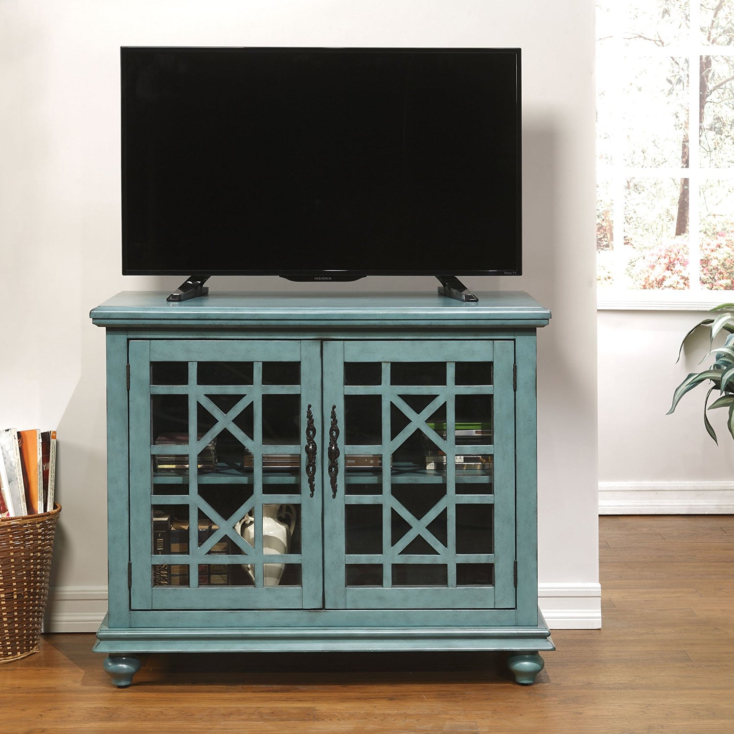 The Elegant Small Spaces collection is designed for with functionality in mind to be used as an occasional or accent cabinet in any room in the home or as a TV Stand. This piece features a beautiful Teal painted finish with sophisticated transitional styling inspired by design cues taken from Parisian antique markets. Elegant trellis details on the two glass doors, intricately cast door pulls, turned bun feet, and architectural moldings are all blended together for an exquisite look. Each piece is slightly distressed with just the right amount of rub through at the edges to make it seem like this was a piece handed down through generations. Features the Lightning Fast Assembly System which allows for assembly in under 10 minutes. One large removable and adjustable shelf provides versatile storage options for TV components, games, books, and other belongings . Vertical wire management cutouts allow for easy access with multiple shelf configurations. Ideal for TVs up to 42 inches. Anti-tip kit added for safety. Assembled Dimensions: 38" W x 32" H x 18" D. Product Materials: MDF, Acacia wood, Glass.