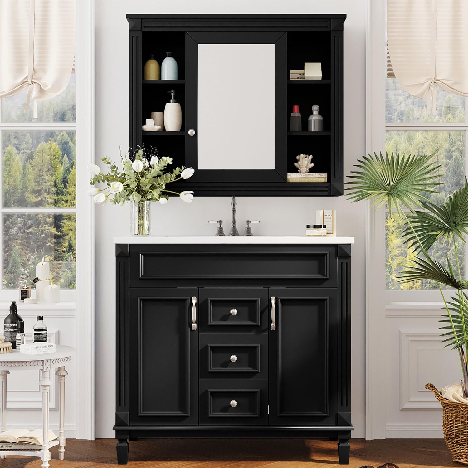 - Exquisitely Detailed - The bathroom vanity cabinet with matching medicine cabinet is outfitted with elegant lines on the cabinet door and drawer faces for a transitional look. Vintage metal knobs allow easy access to the vanity cabinets and central drawers, with a color matched finished interior.