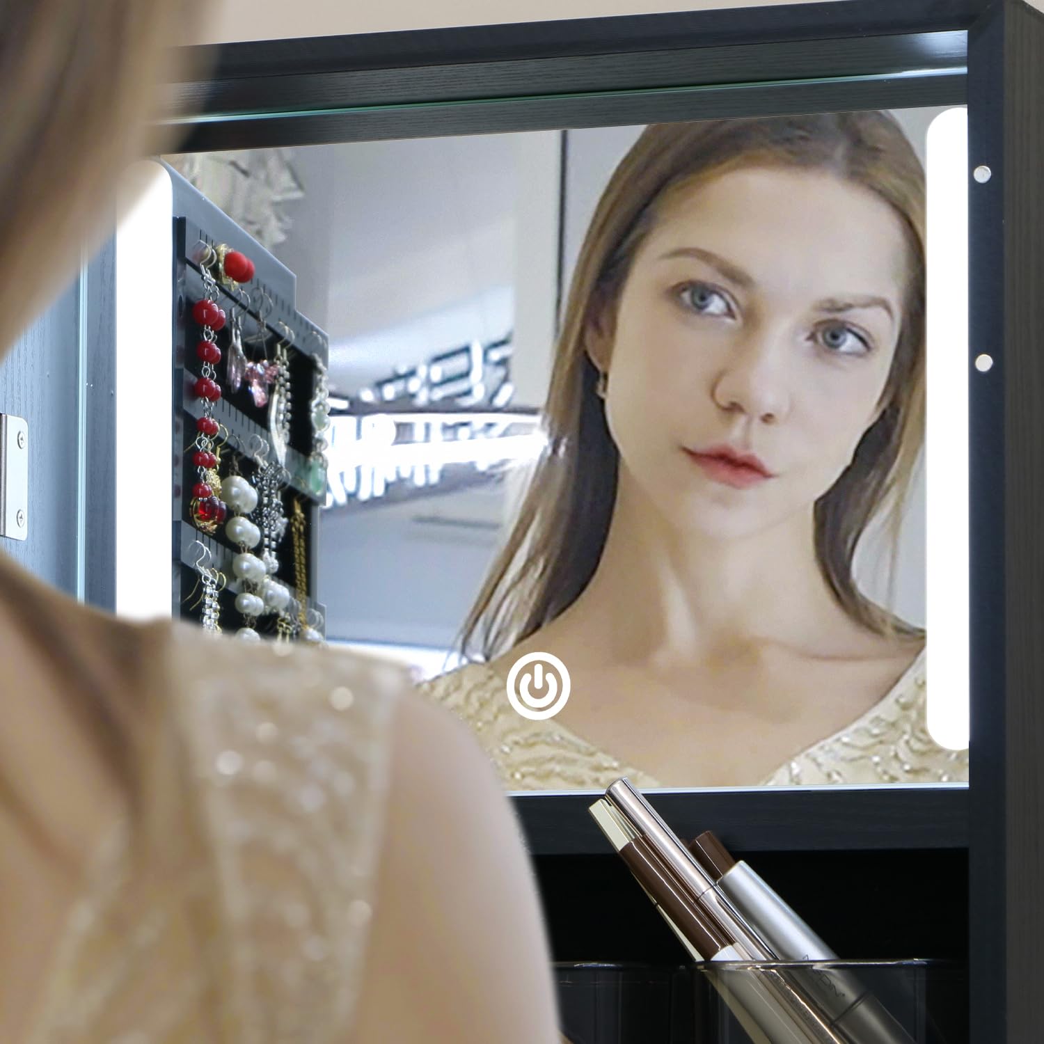 - Touch Makeup Mirror,Convenient for makeup, jewelry fitting, skin care, no need to open and close the door frequently, use full body mirror. Unlike other jewelry mirrors where the light beads are exposed, our jewelry mirrors use laser coating technology, so even if you look directly at the light source, you won't feel any pain in your eyes, protect your eyes.