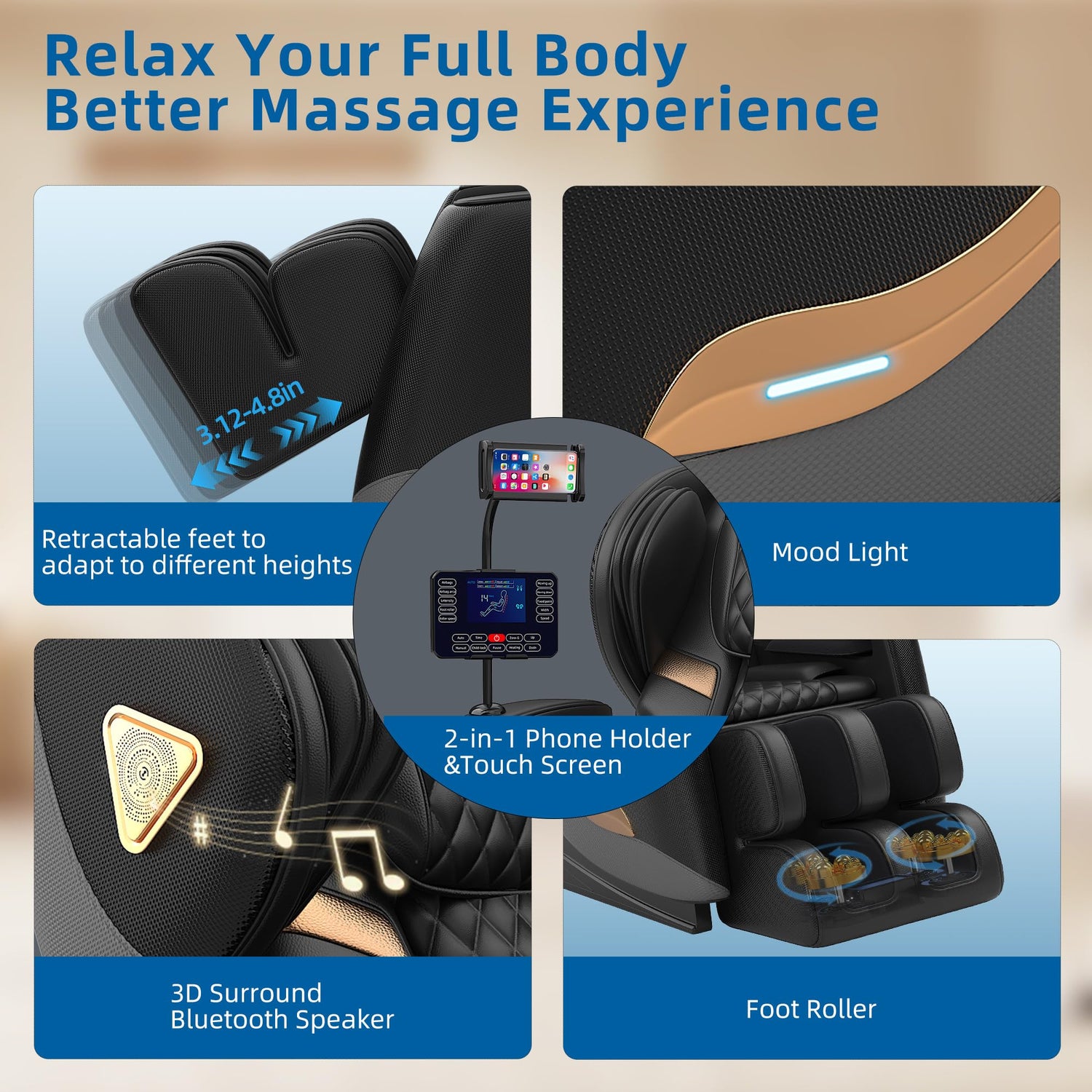- Smart Technology for Personalized Massage: With Bluetooth connectivity and a user-friendly touch screen controller, customizing your massage experience has never been easier. Choose from 20 auto massage modes tailored for everything from deep shiatsu sessions to gentle air pressure massages, making this the professional massage chair full body for all ages, including the elderly.