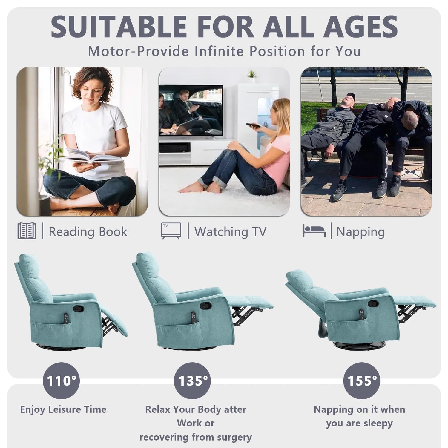 The slim recliners for small spaces come with a 360° swivel base and gentle rocking feature; Perfect for adding smooth motion and extra comfort to your seating experience