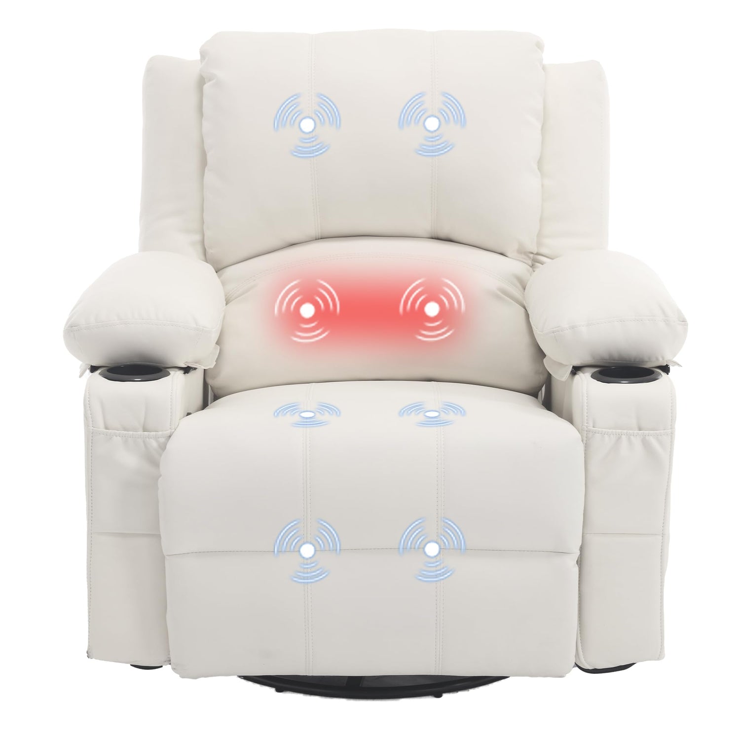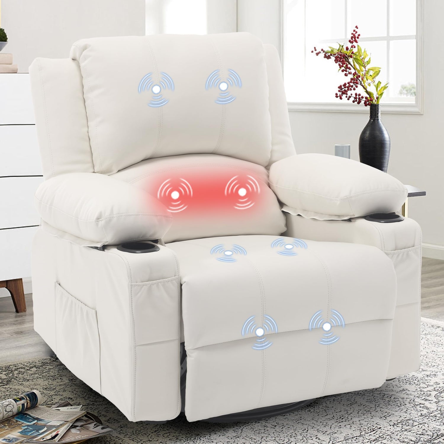 Massage Swivel Rocker Recliner with Lumbar Heat, Overstuffed PU Leather Recliners for Living Room, Modern Single Rocking Chair for Adults, Manual Rocker Recliner with Cup Holders for Bedroom, White