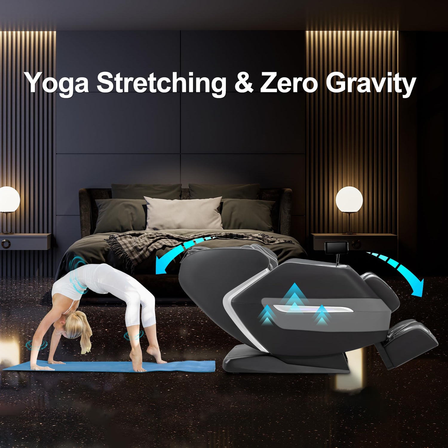 - Zero-Gravity Recline & Yoga Stretch The Zero-Gravity recline feature relieves spinal pressure, while the Yoga Stretch mode provides full-body stretches to release tension and improve flexibility.