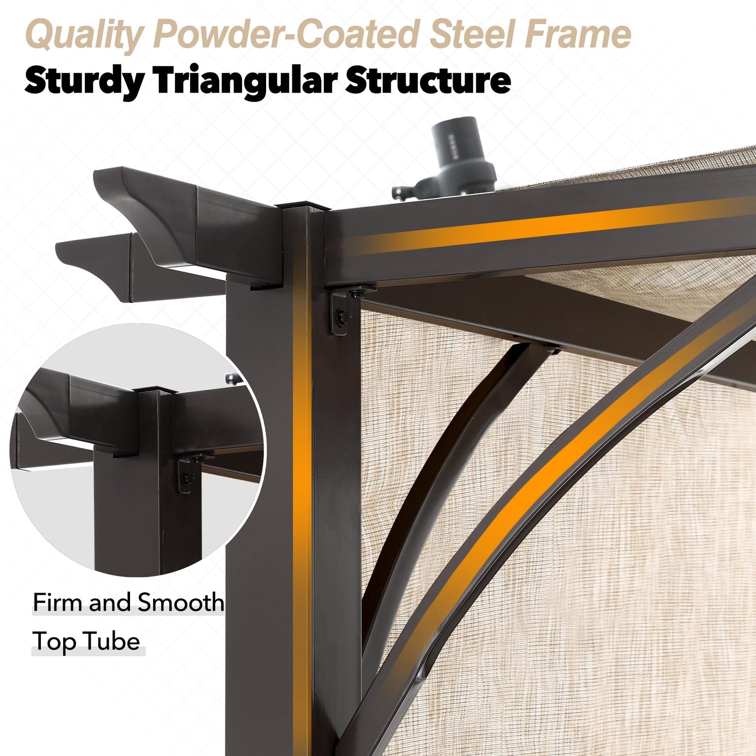- 🔵Sturdy Construction: The frame is made of high-grade steel and coated with rustproof layer, which can resist chipping, peeling, rust and corrosion, withstand various weather elements, provide extra durability and prolong the pergola's service life.