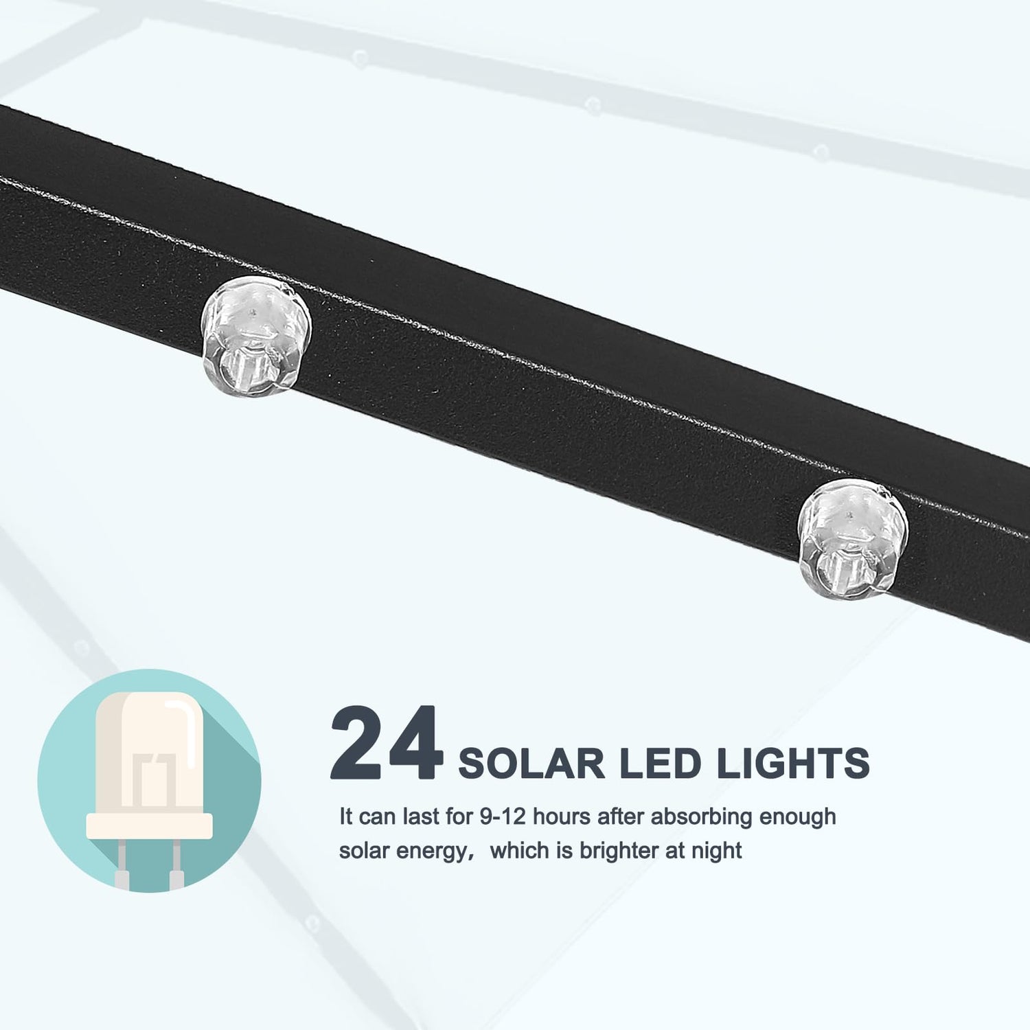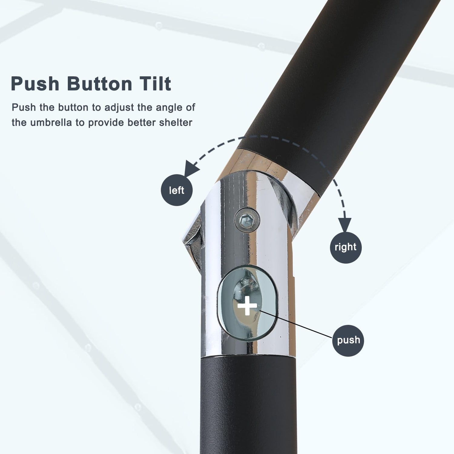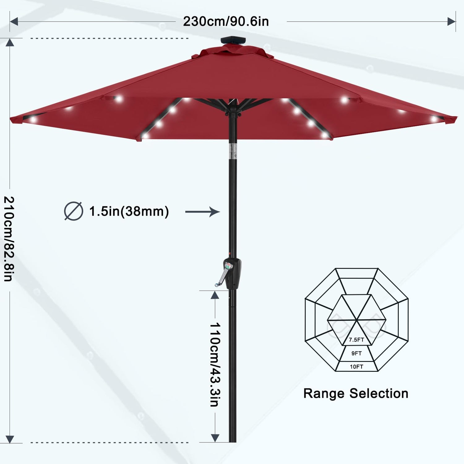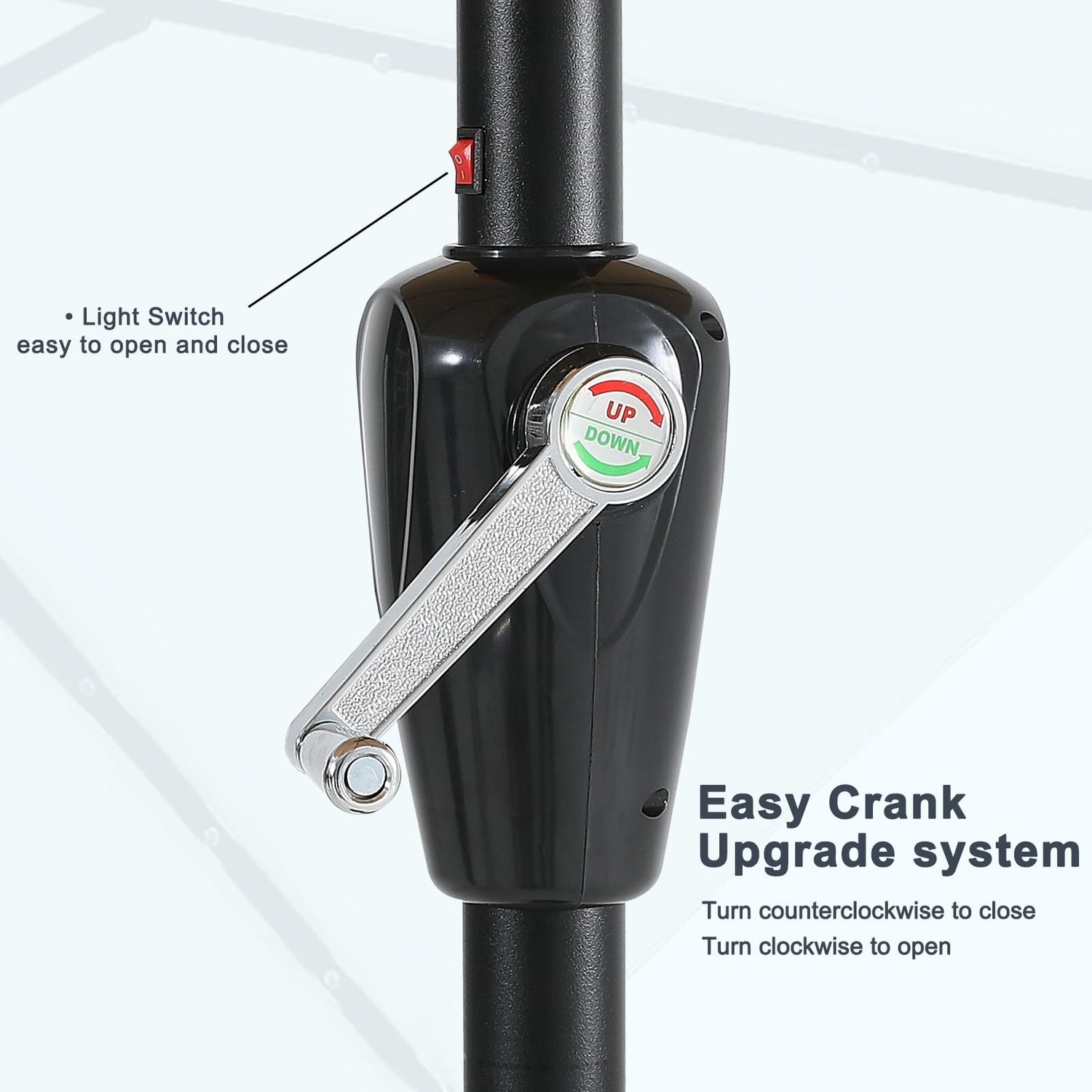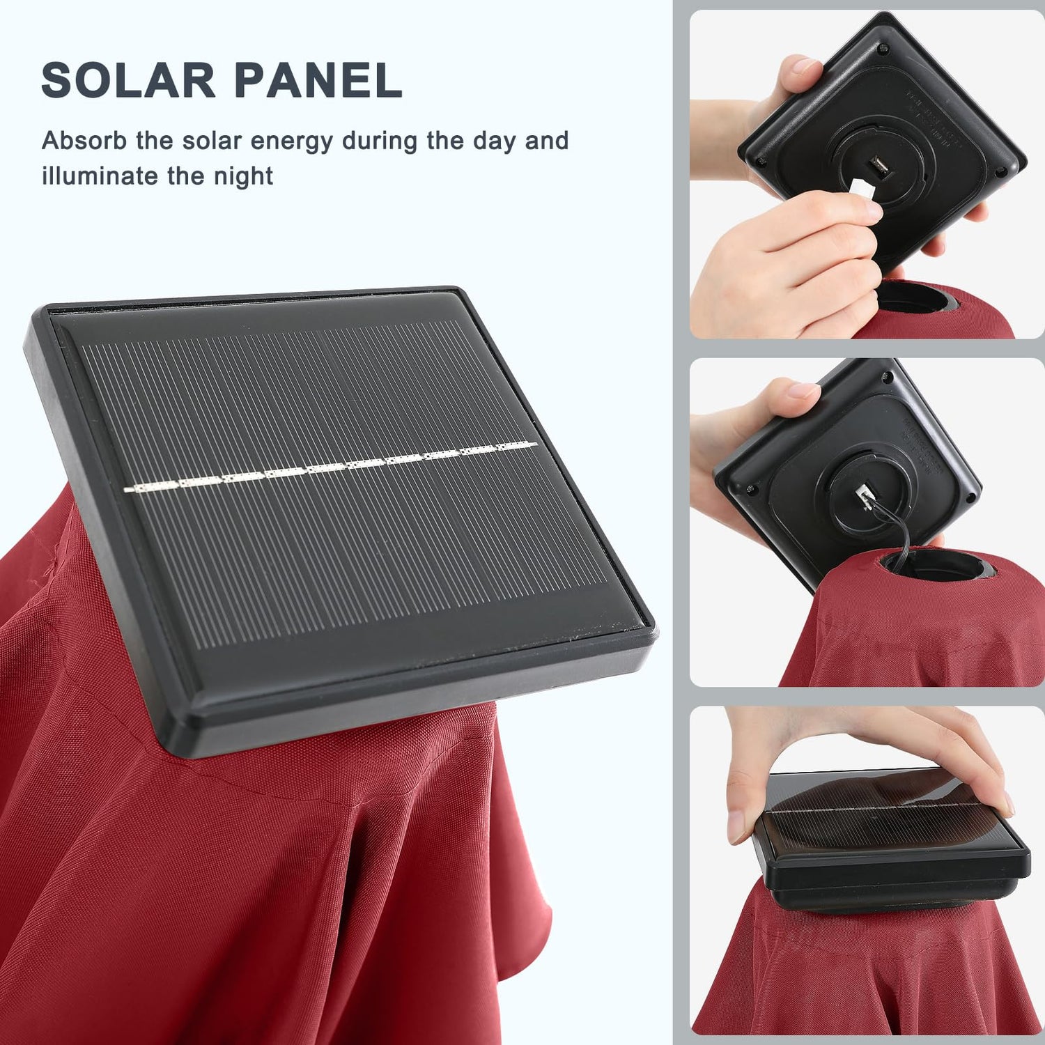 - ⛱️Solar-Powered Lights: Use it day and night. Patio umbrella with LED solar lights lasting for 9-12 hours. ON and OFF switch. Solar panel on top powered by rechargeable battery. No electricity or power cord needed. Energy efficient and convenient.