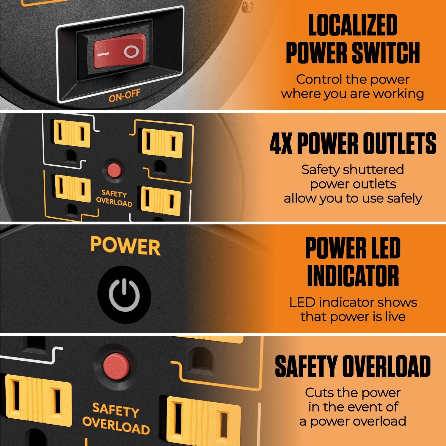 • BUILT IN SAFETY OVERLOAD CIRCUIT BREAKER: cuts the power in the event of a power overload and allows you to reset if a cut-out occurs