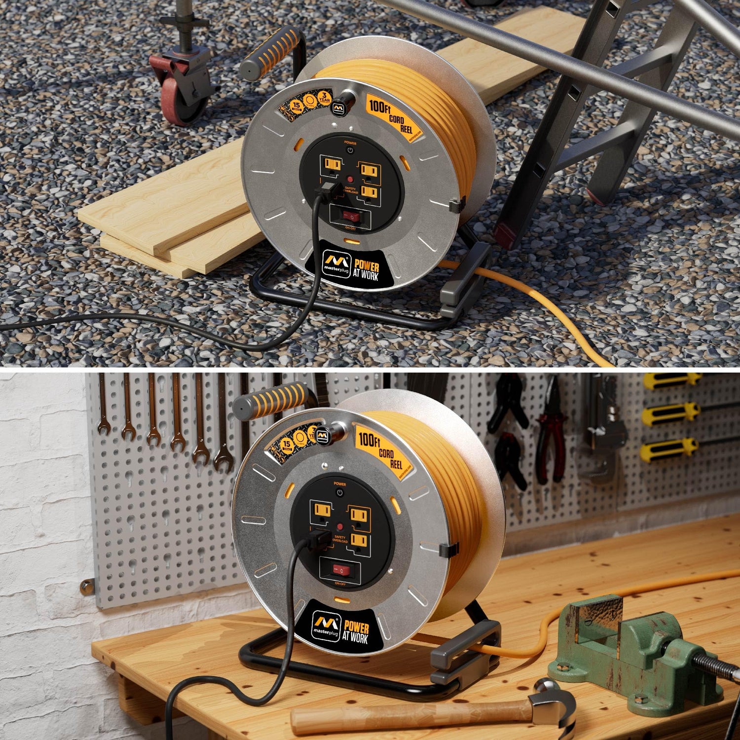 • 100FT METAL EXTENSION CORD REEL: have power where you need it with Masterplug Cable Reels, 4 shuttered power outlets, integrated power switch and safety overload circuit breaker protects against power overloading, for a safe easy-to-use portable power solution