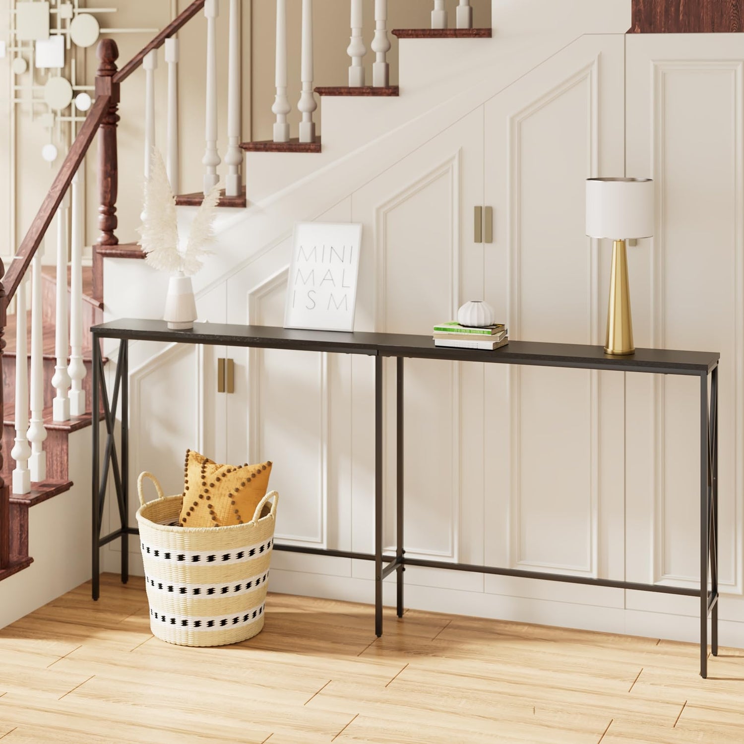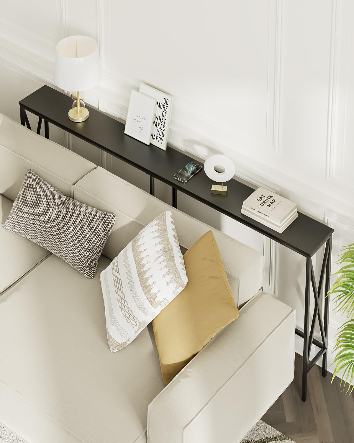 - Small Space, Big Use: The narrow console table is 70.9"W x31.7"Hx7.9"D, skinny figure is specifically designed to creating more storage space for coffee, books, keys, bags and laptop. Perfectly suited for narrow areas, such as behind a sofa.