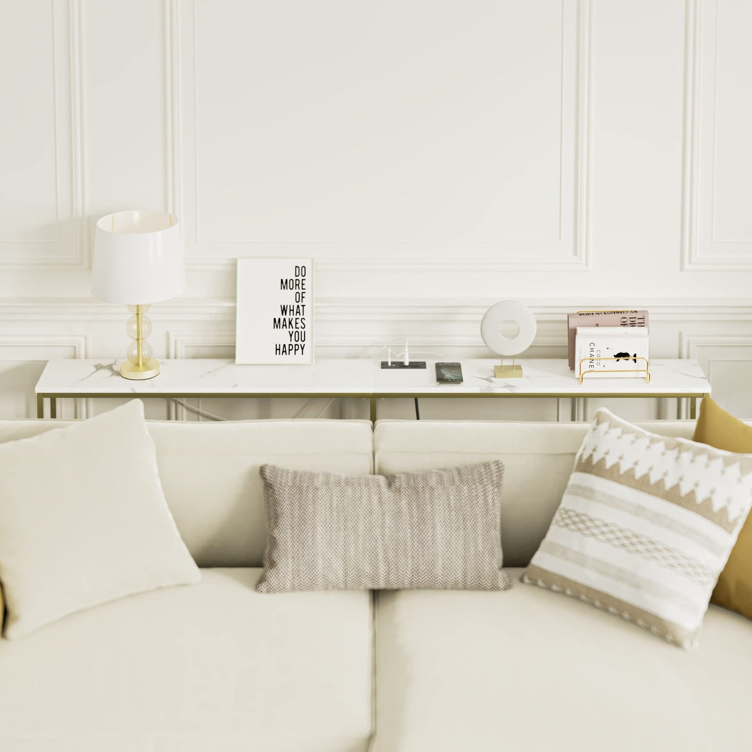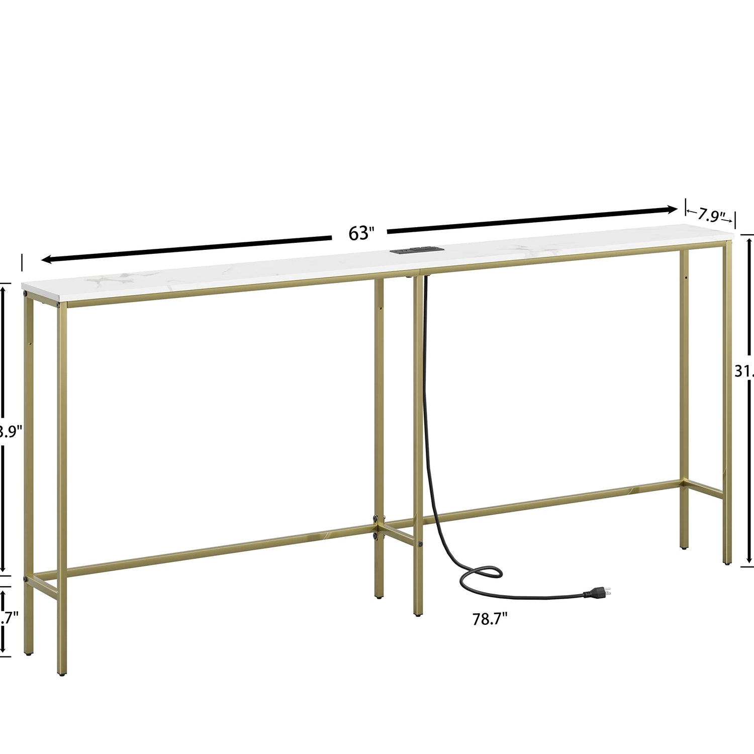 Masupu 70.9 Inch Console Table with Power Outlet,Modern Narrow Long Sofa Table Behind Couch,Skinny Entry Table with Gold Metal Frame for Entryway,Living Room, Hallway,Marble White