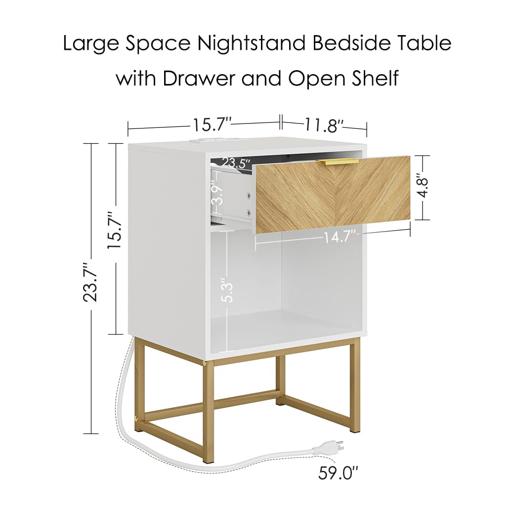 - Product Features: Unique Modern Design: This night stand combines farmhouse and boho decor styles with a distinctive wood grain finish. The drawer and elegant lines, along with the gold and oak elements, add a touch of sophistication and charm to your bedroom furniture.