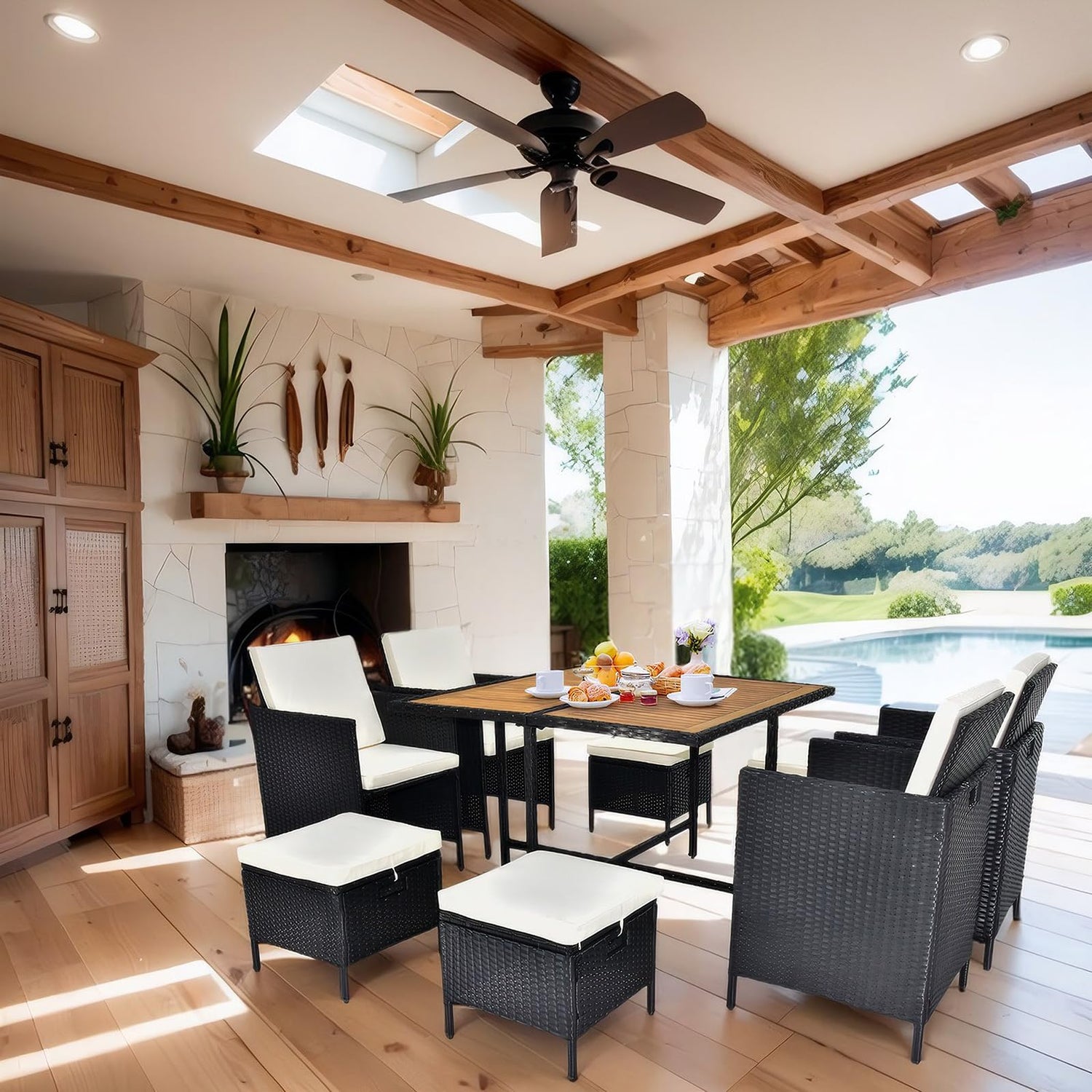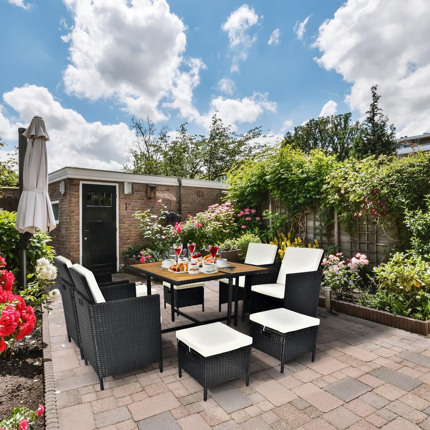 MATONELL 9 Piece Acacia Wood Patio Dining Set, Space Saving Wicker Chairs with Soft Cushions and Wood Table, Outdoor Furniture Set for Garden Yard Poolside, Black