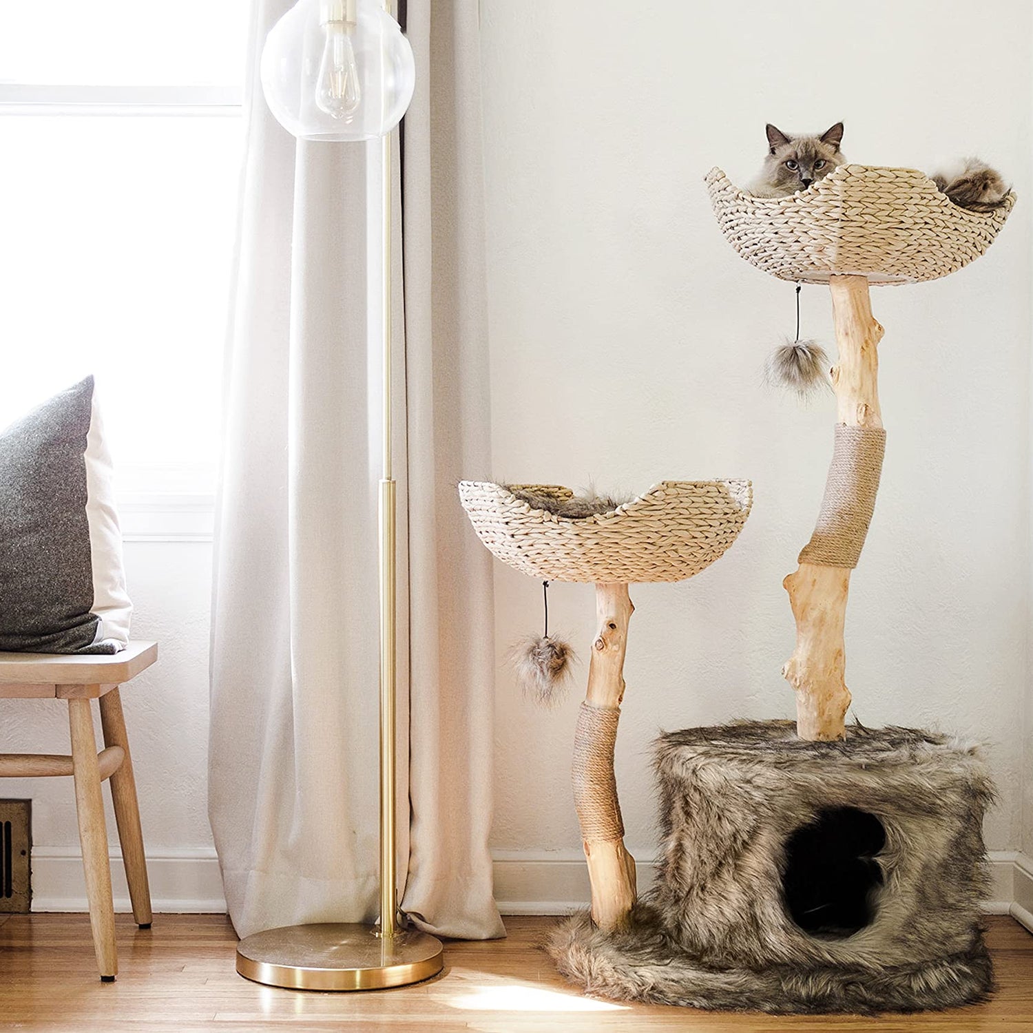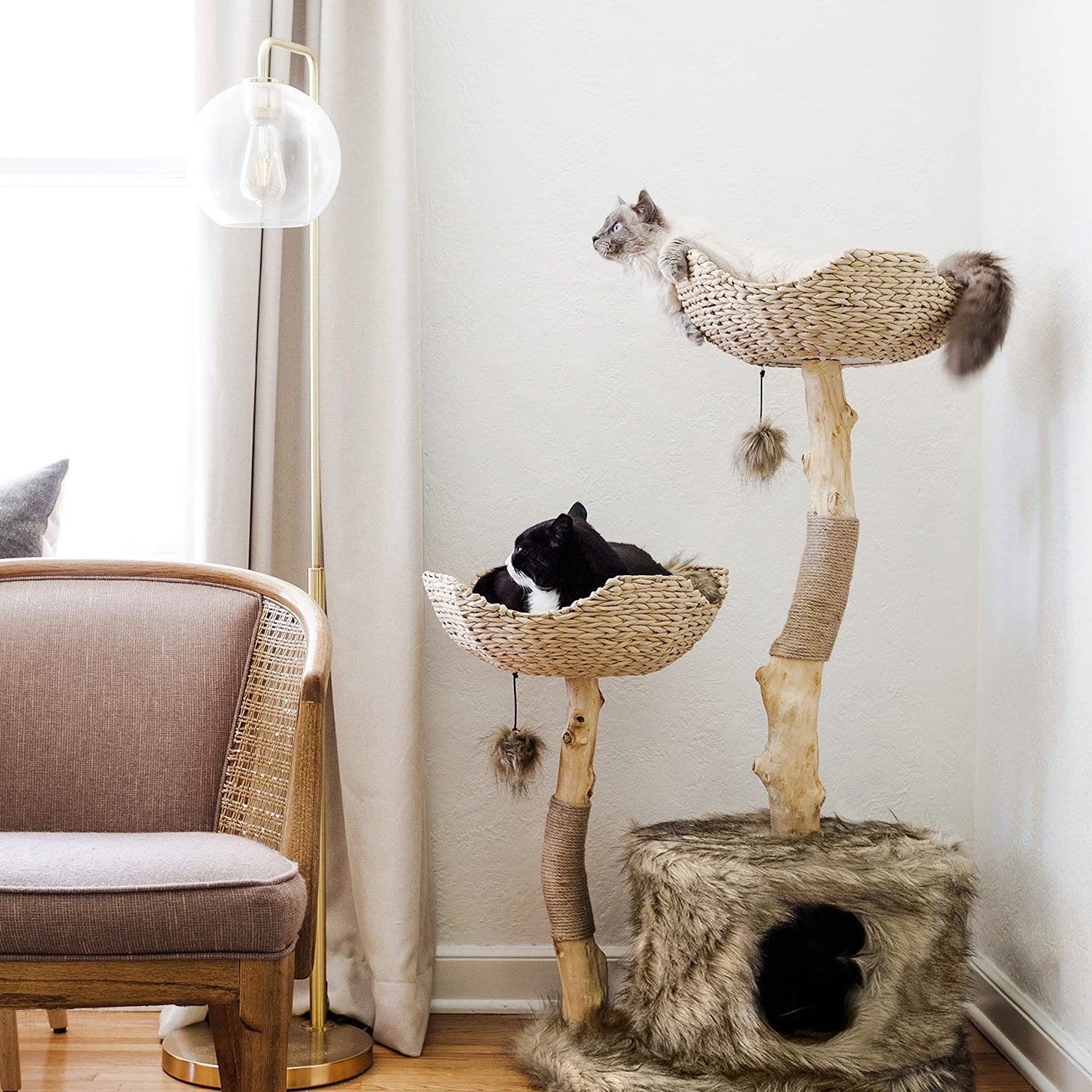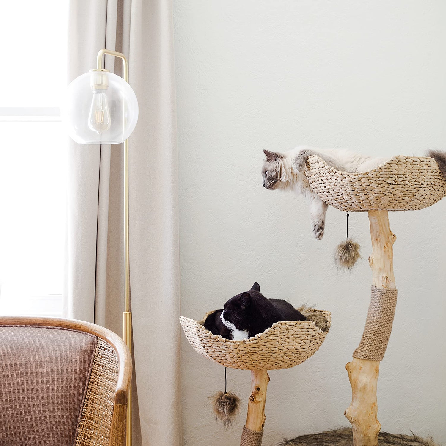 - BEAUTIFUL & UNIQUE DESIGN: Unlike most cat furniture, this wood and wicker cat tree tower will enhance the look of your home. It includes two beautifully crafted, one of a kind trunks that hold two hand woven wicker baskets containing extremely comfortable cushions (removable and machine washable). It is perfect for your kitty to have a glorious time napping while you can enjoy looking at a beautiful piece of art that adds to your homes aesthetics.