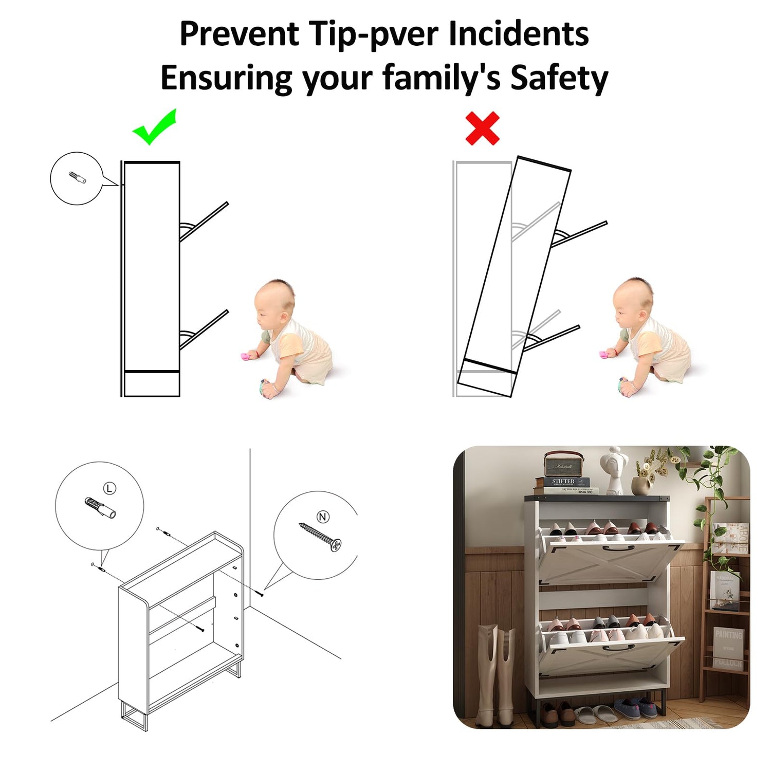 - 【Safe and Reliable Quality】: This slim shoe cabinet contains an anti-tipping device, which can be fixed on the wall to prevent tipping and protect children's safety. Made of high-quality MDF wood and metal legs, the stable structure ensures super load-bearing capacity. The black metal handle is simple and elegant, feels comfortable, and prevents scratches and injuries during use. Metal legs have rubber pads on the bottom to provide stable support while preventing the floor from being scratched.