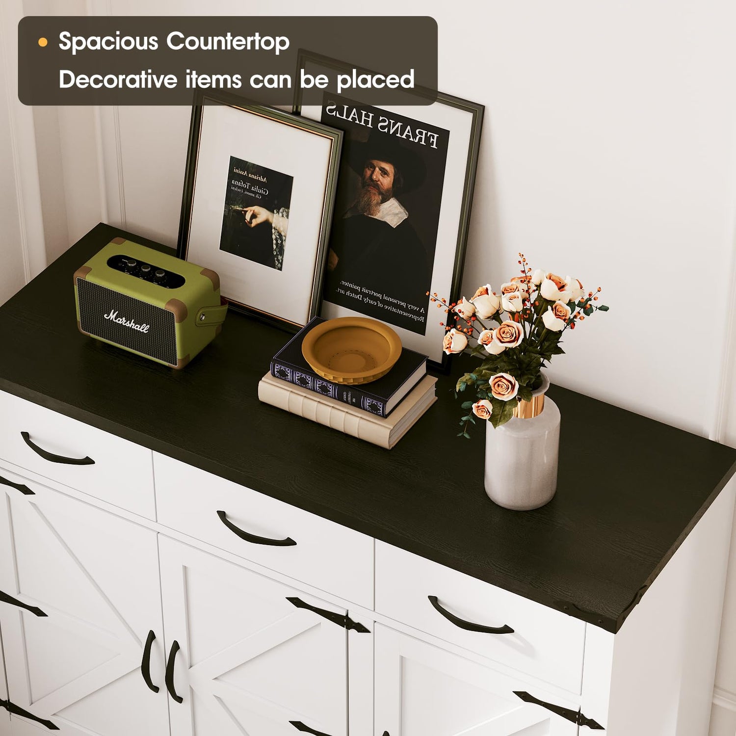 - Modern Farmhouse Style: Our sideboard buffet features a farmhouse style design, with smooth black top that contrast sharply with the overall white design, making it even more elegant. Comfortable black metal handles serve as embellishments, perfectly blending rural charm with classic modern style, making it a versatile choice for various interior decoration styles