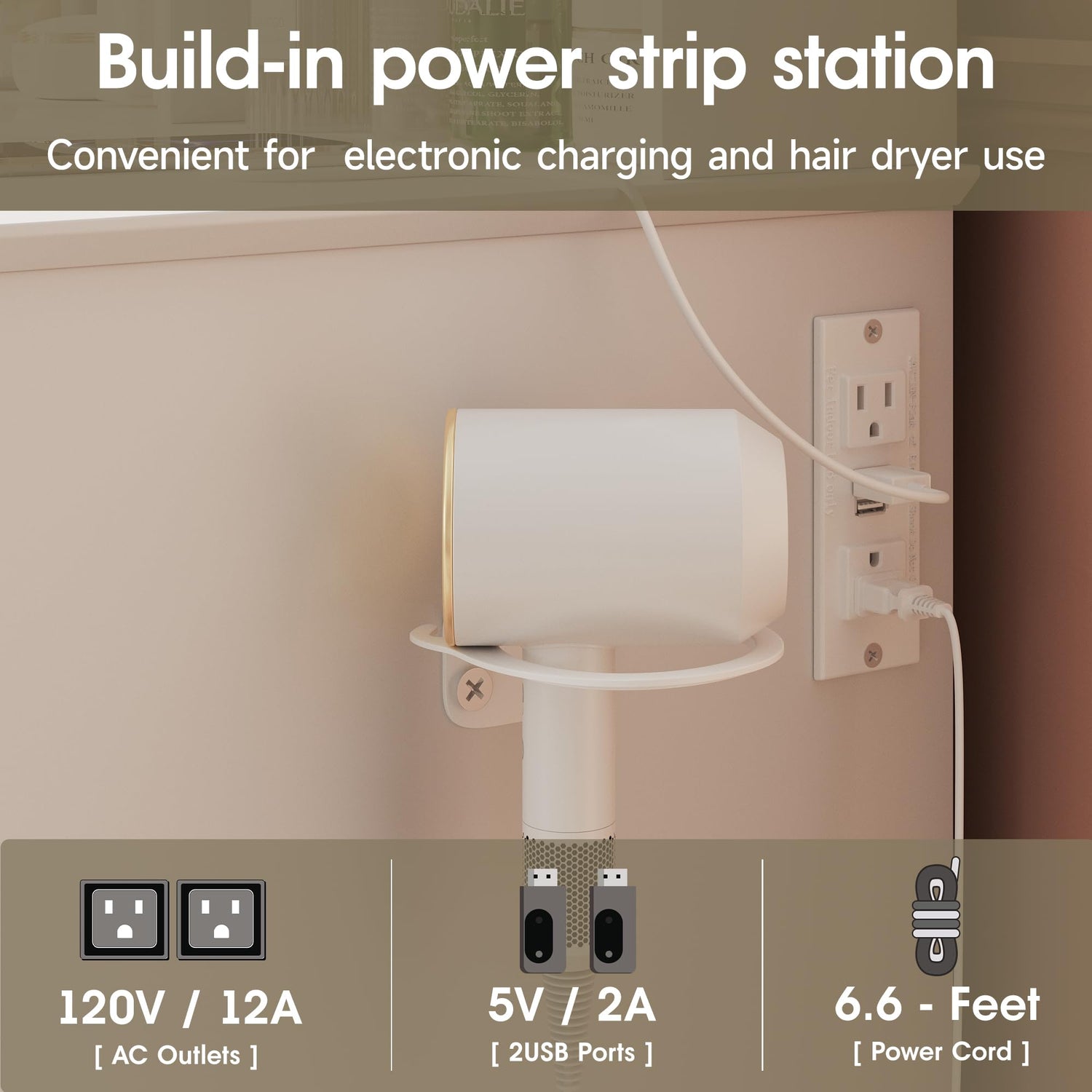 - Multi-functional Features:Vanity with lights equipped with 2 standard sockets and 2 USB charging ports, which allows you to charge multiple devices simultaneously. An added hair dryer holder ensures styling tools are always within reach