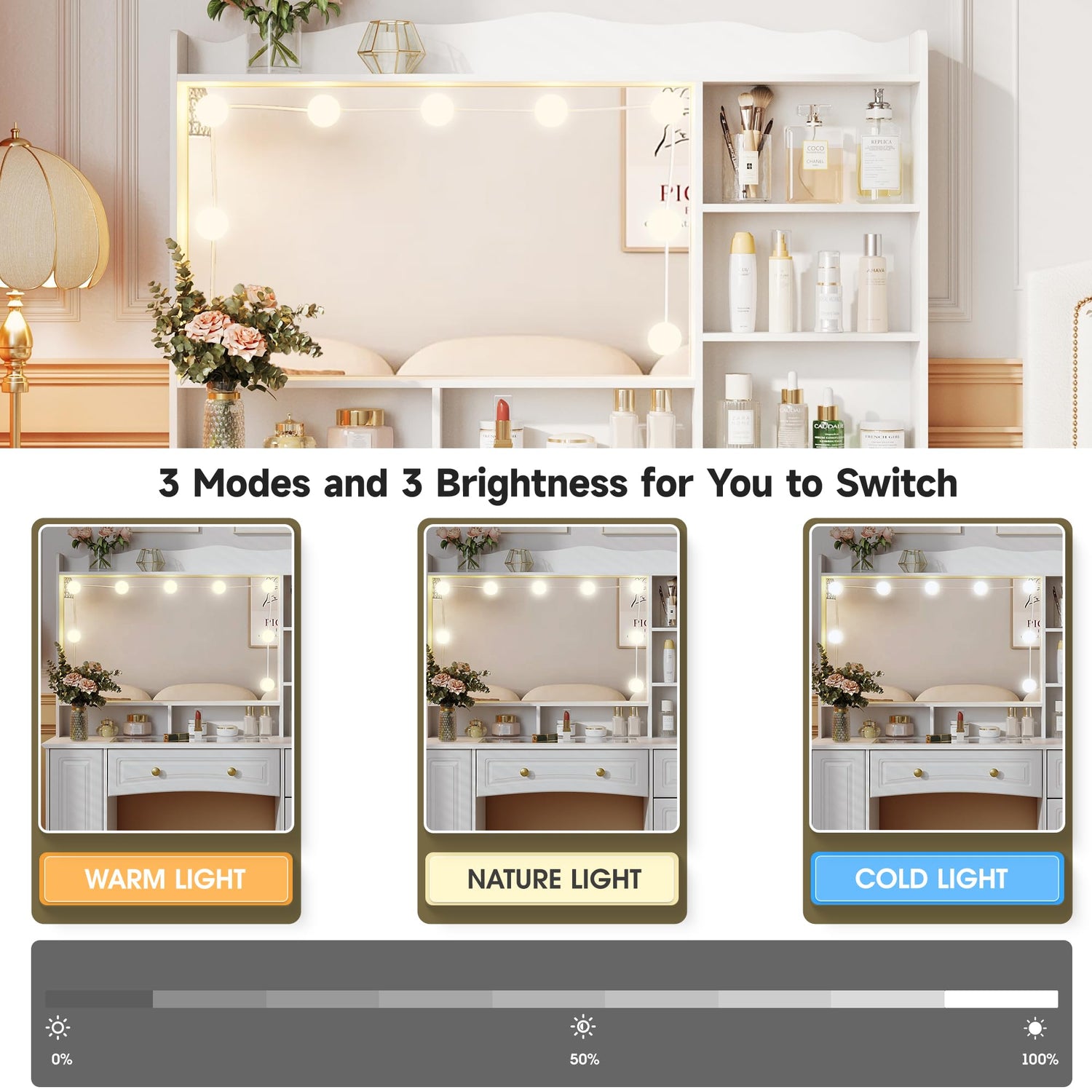 - Adjustable LED Lighting: This vanity with mirror features 9 adjustable LED bulbs to Illuminate your beauty rituals. Whether you’re preparing for a day at work or a night out, you can customize the brightness to create the perfect makeup environment at any time