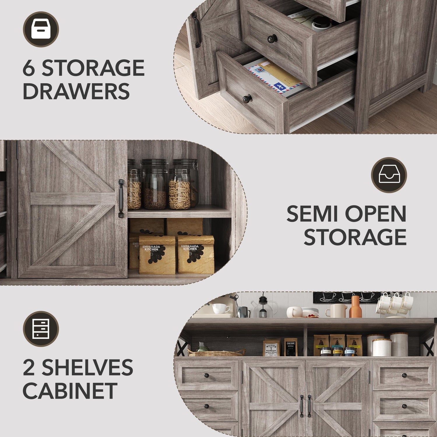 - Ample Storage Space: This 59’‘ Large buffet cabinet features a big cabinet and 6 drawers, along with a spacious tabletop perfect for placing a coffee maker or microwave. The six drawers allow you to keep utensils, napkins, and other essentials neatly organized. The cabinet with Barn door design include adjustable internal shelves, ideal for storing items of varying sizes. Additionally, the open cabinets offer versatile storage options for decor.