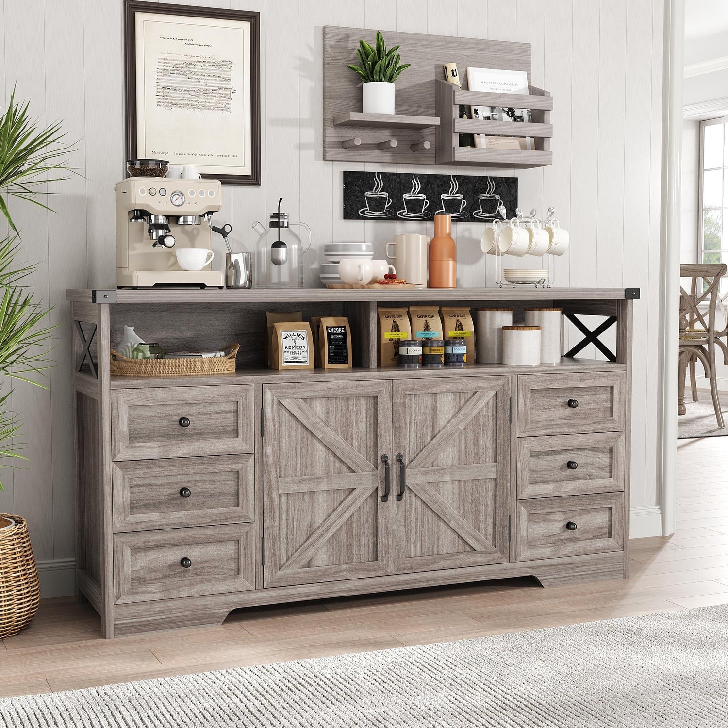 Maupvit 59" Buffet Cabinet with Storage, Farmhouse Sideboard Cabinet with 6 Drawers and Open Shelves, Adjustable Shelf, Large Coffee Bar Station Table for Kitchen, Dining, Living Room, Grey