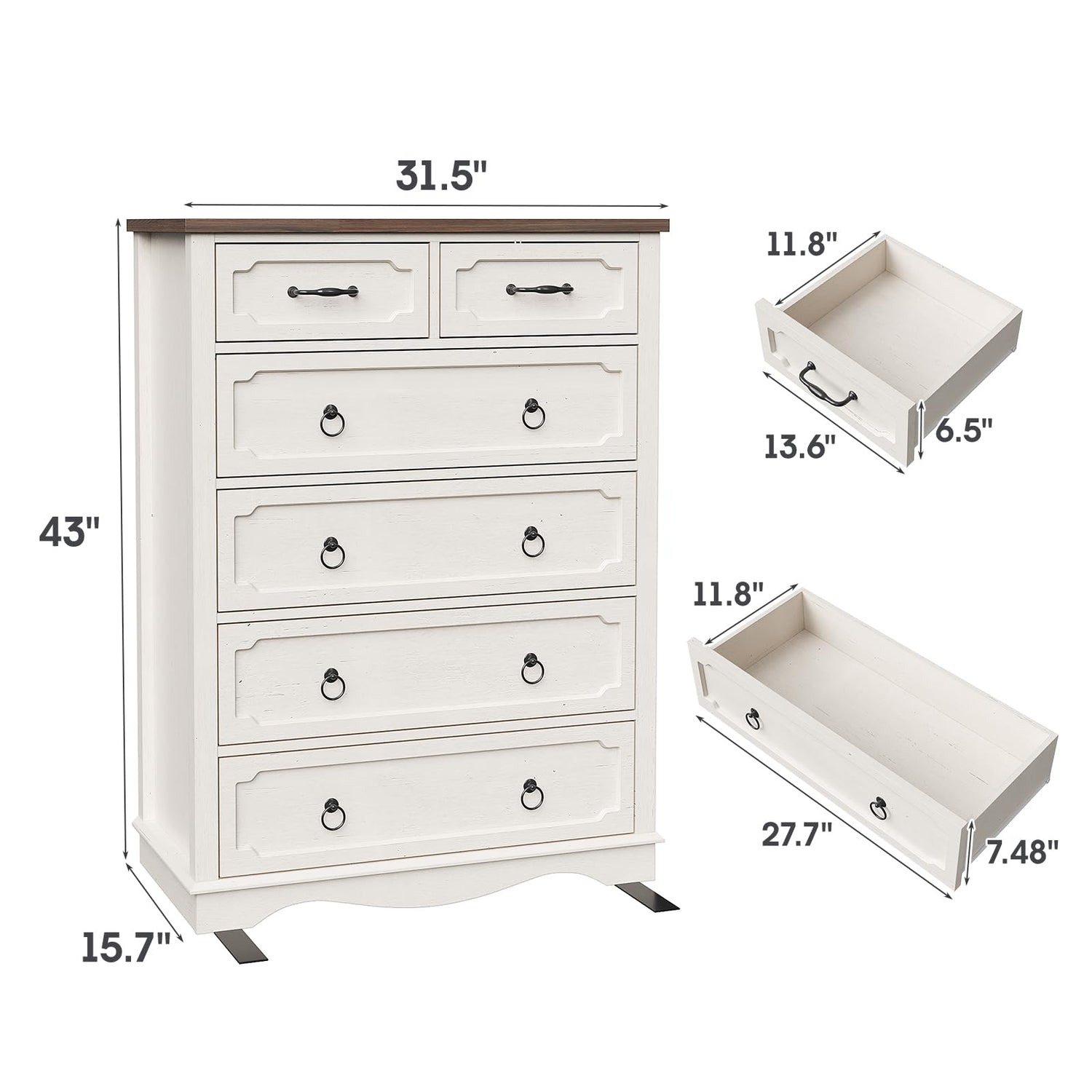 Maupvit 6 Drawer Dresser, 43" Tall Chest of Drawers for Bedroom, Farmhouse Dresser with Large Drawers & Metal Ring Pull Handles, Wood Dressers for Living Room, Hallway, Entryway, Antique White