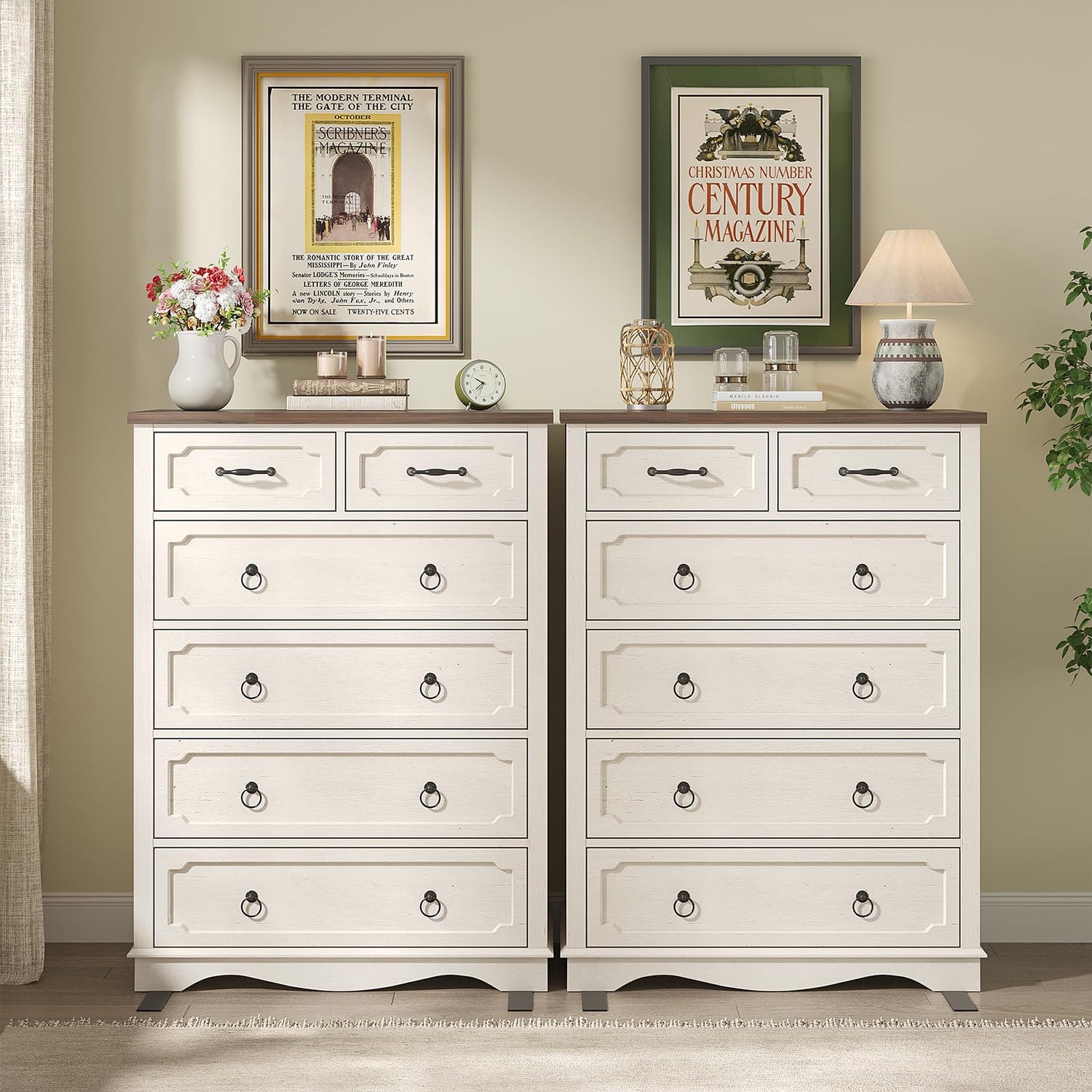 - Farmhouse White Dresser: The bedroom dresser, paired with a natural wood-grain tabletop and metal circular pull handles, beautifully blends modern farmhouse style with rustic charm. Whether placed in the bedroom or living room, this tall dresser serves as a focal point, infusing your home with sophisticated yet understated luxury