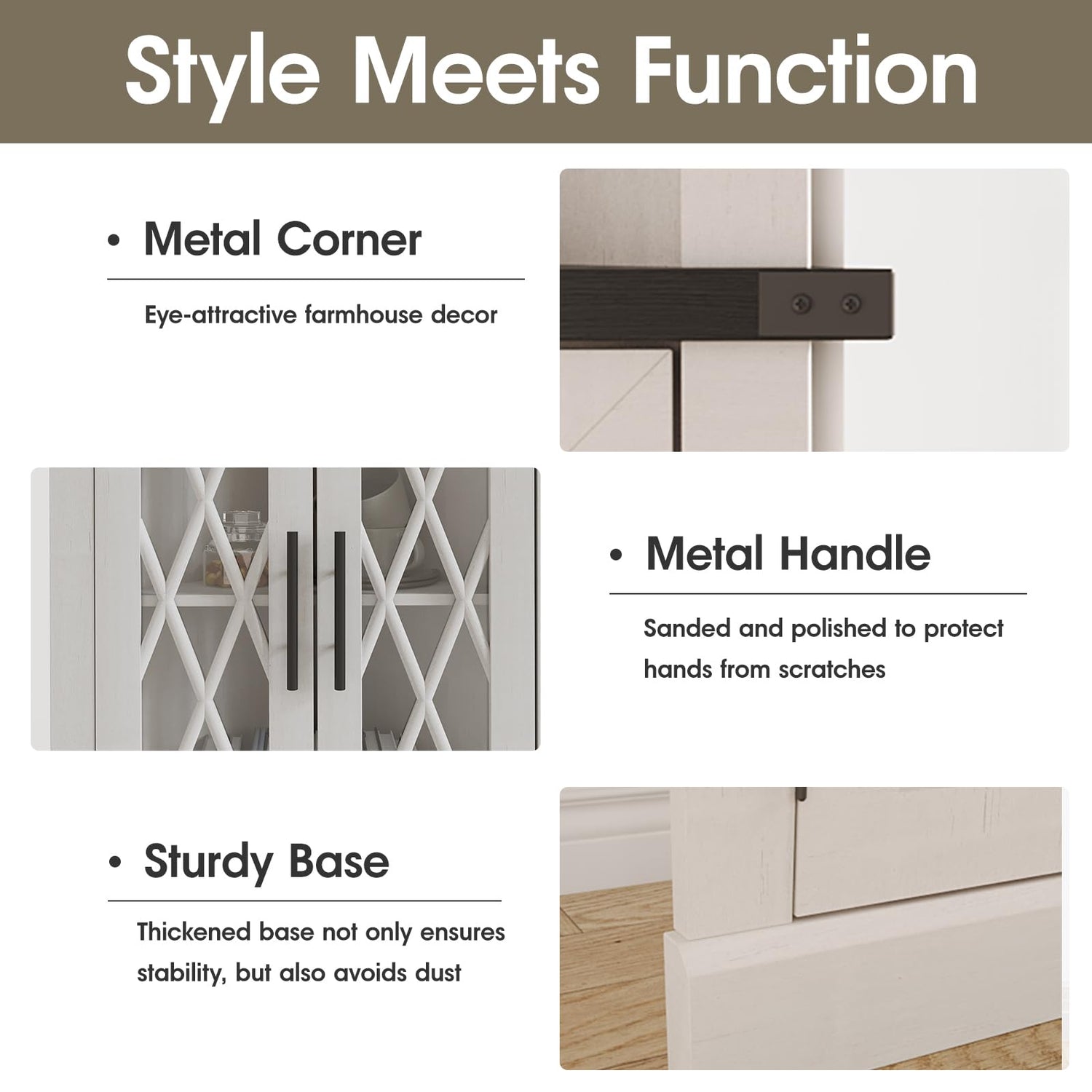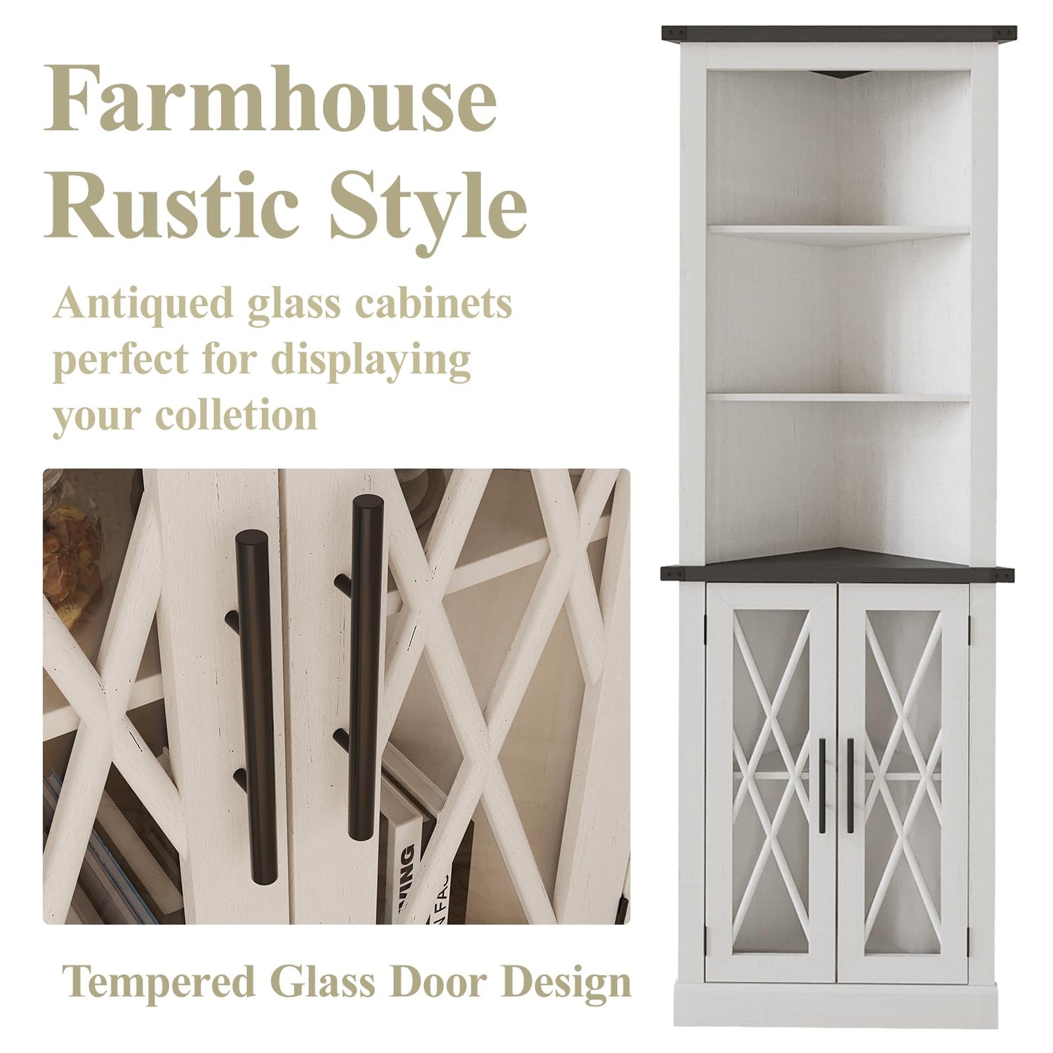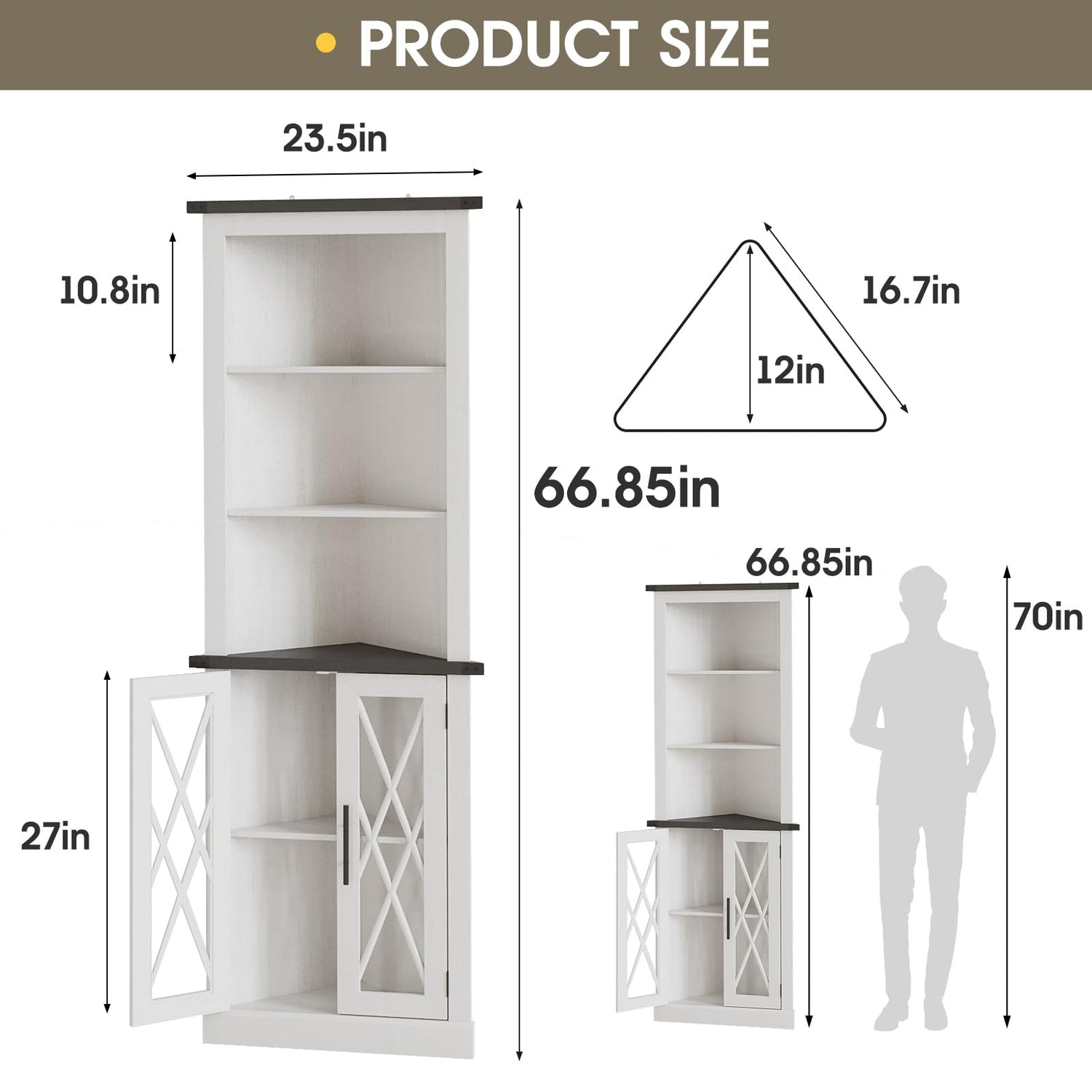 Maupvit 66.8" Tall Corner Cabinet with 2 Glass Doors, Modern Storage Cabinet with Adjustable Shelves, Corner Display Cabinet for Living Room, Bathroom, Hallway, Retro White