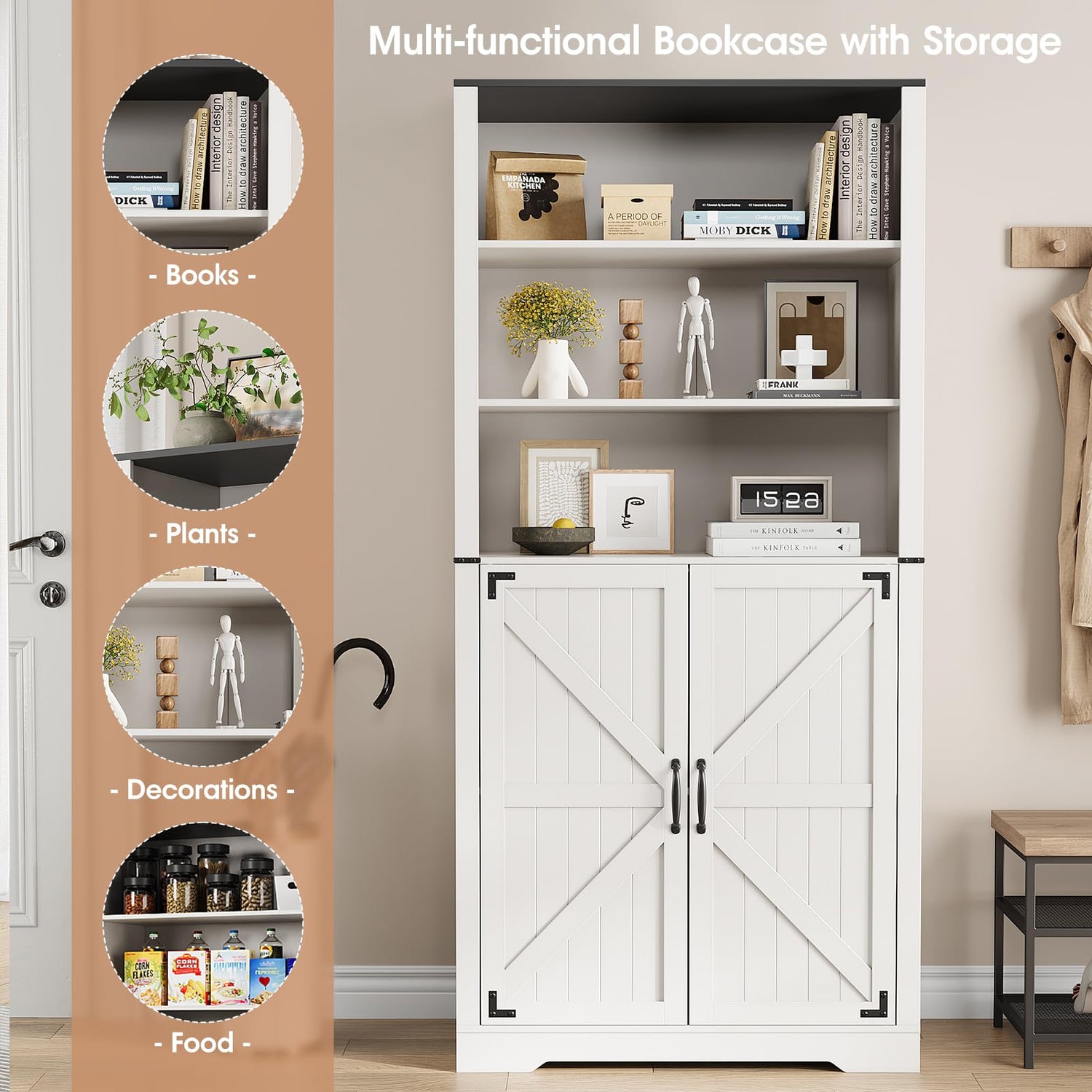 - Classic Bookshelf with Doors: Our bookshelf storage cabinet features a classic white finish, black top, clean lines, and elegent door handles, making it suitable for almost any space in the home. The bookshelf is equipped with storage cabinet to meet storage needs, and 3 open shelves allow you to easily access the books, photo albums, and decorations you want. Not only does it have decorative functions, but it also has good practicality