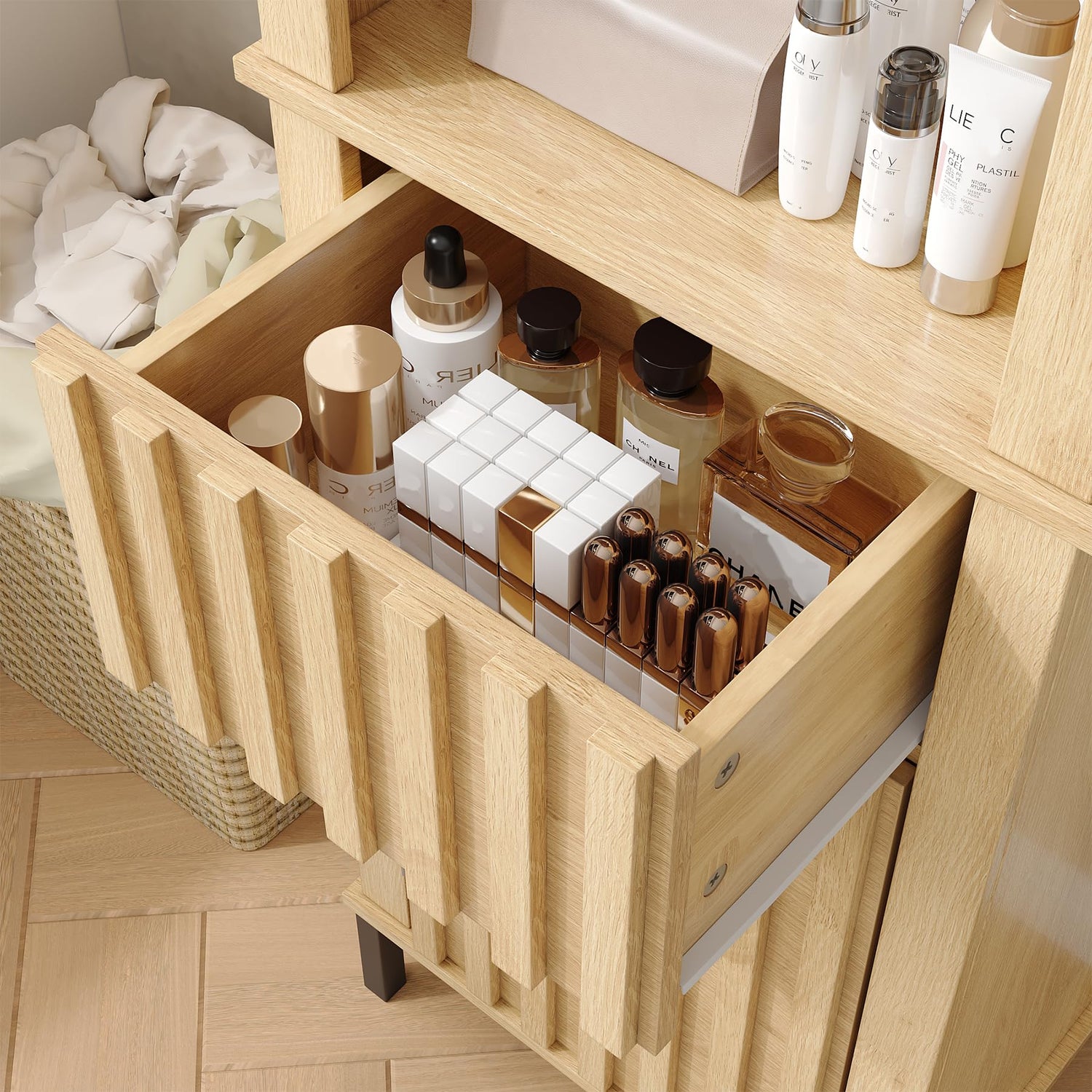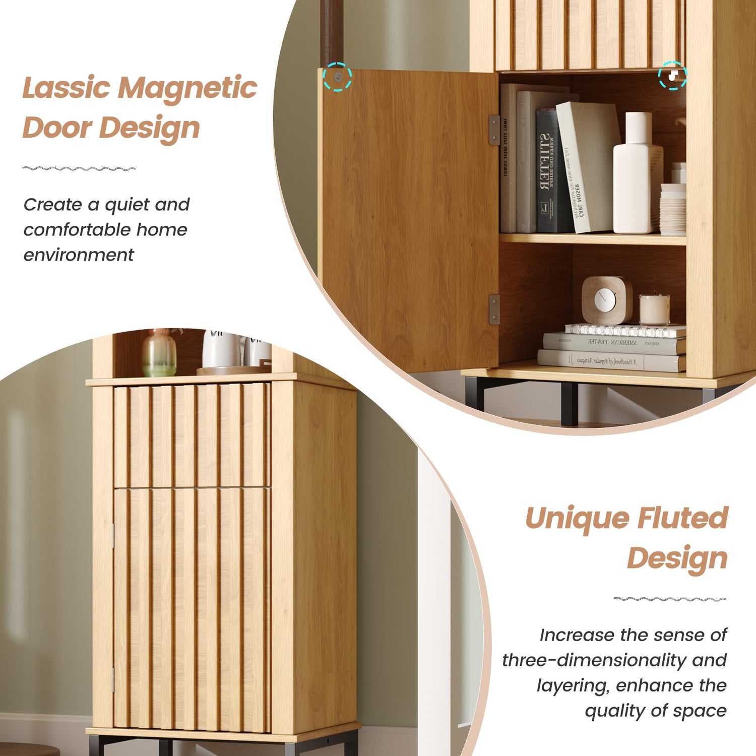- [Customized Storage Space]: The free standing storage cabinets with doors and shelves include 3 open compartment, a sliding drawer and 2 and a bottom cabinet with fluted door, 5 compartments. The baffles between the compartments can be removed or adjusted in height, facilitating you to use more flexibly. Everything finds its place in this chic cabinet, ensuring your space stays tidy and organized