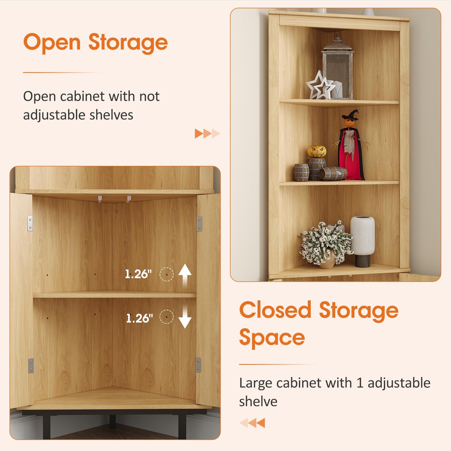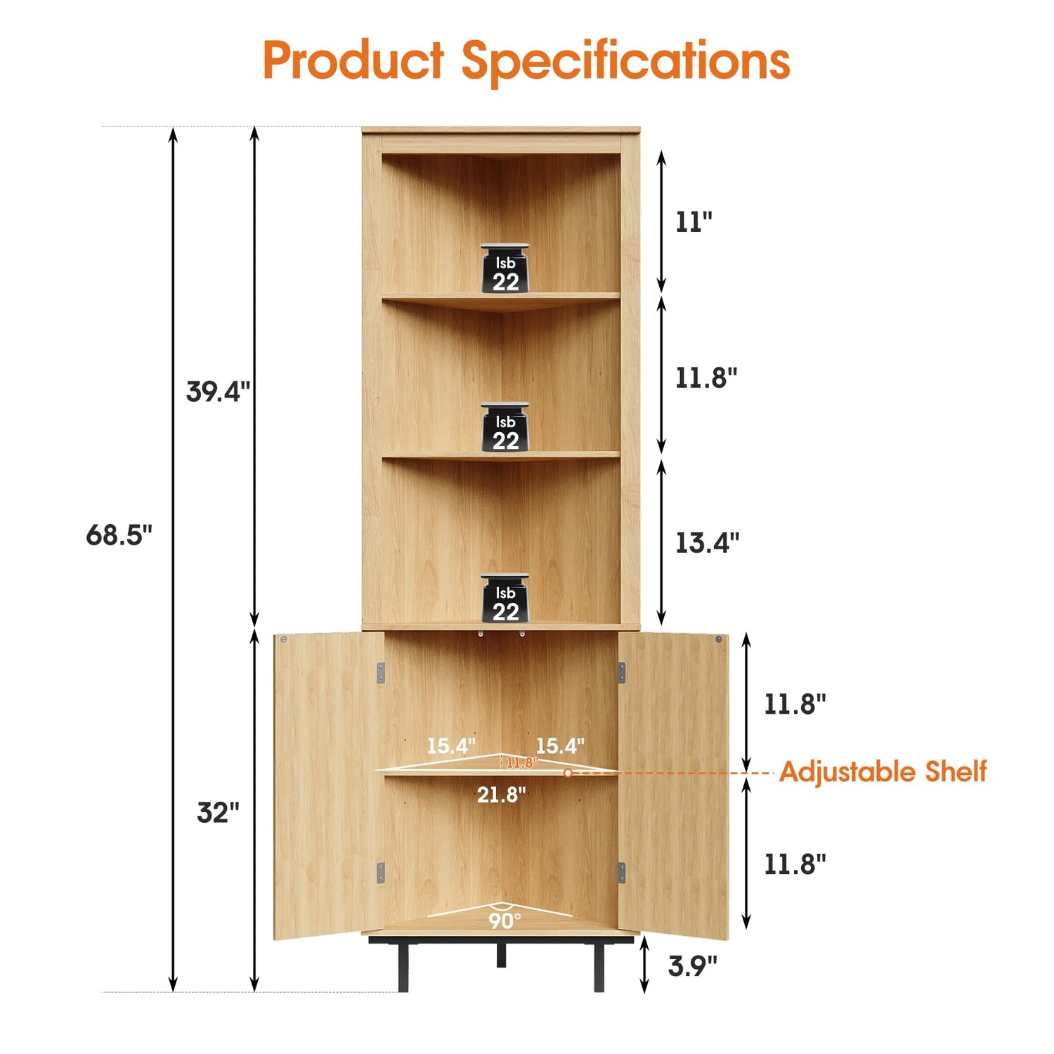 - [Storage Space Tailored To Your Needs] Dimensions: 22"(W) x 13.2"(D) x 68.5"(H). Narrow corner cabinets, in particular, offer a unique opportunity to maximize storage in overlooked or tight spaces and keeping the area tidy. By fitting snugly into the angles of rooms, the corner cabinet has adjustable concealed storage shelf at bottom, which can be adjusted to the appropriate height according to actual needs for more hidden storage space