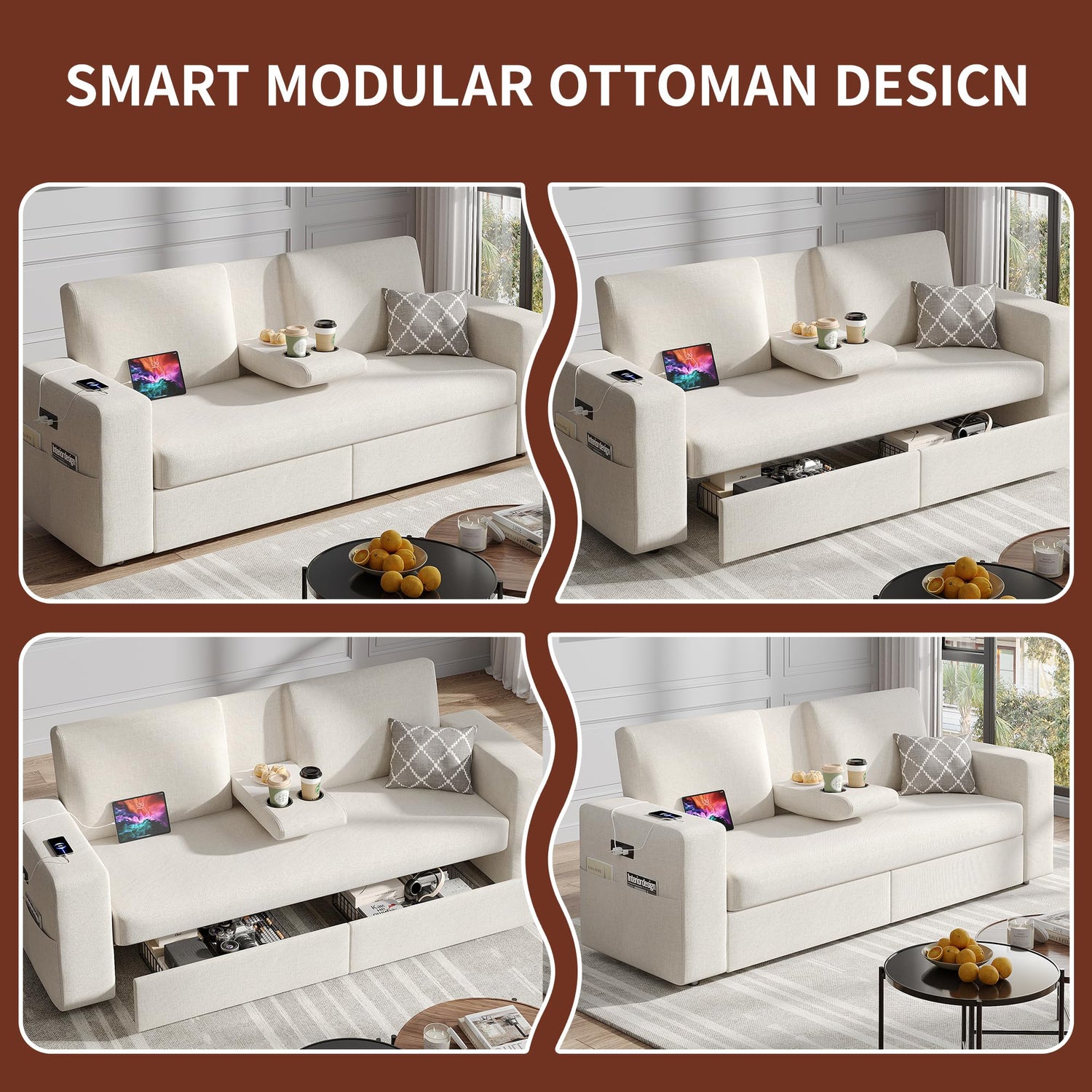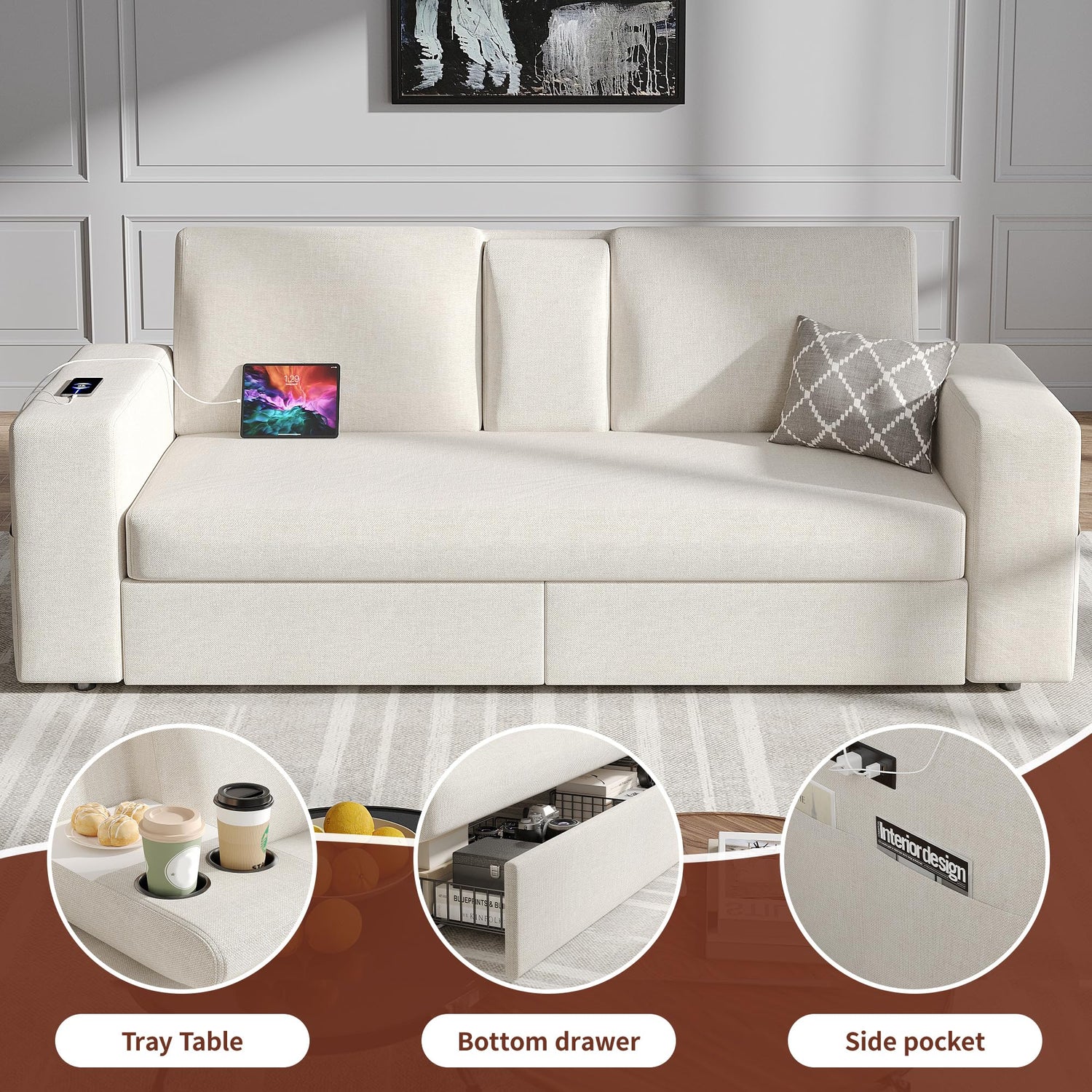 Maupvit 75” Loveseat Sofa with 2 Drawers, USB & Type-C Charging Port, Comfortable Linen Living Room Couch with Small Table Board, Upholstered Small Settee Fits Bedroom, Office,Beige