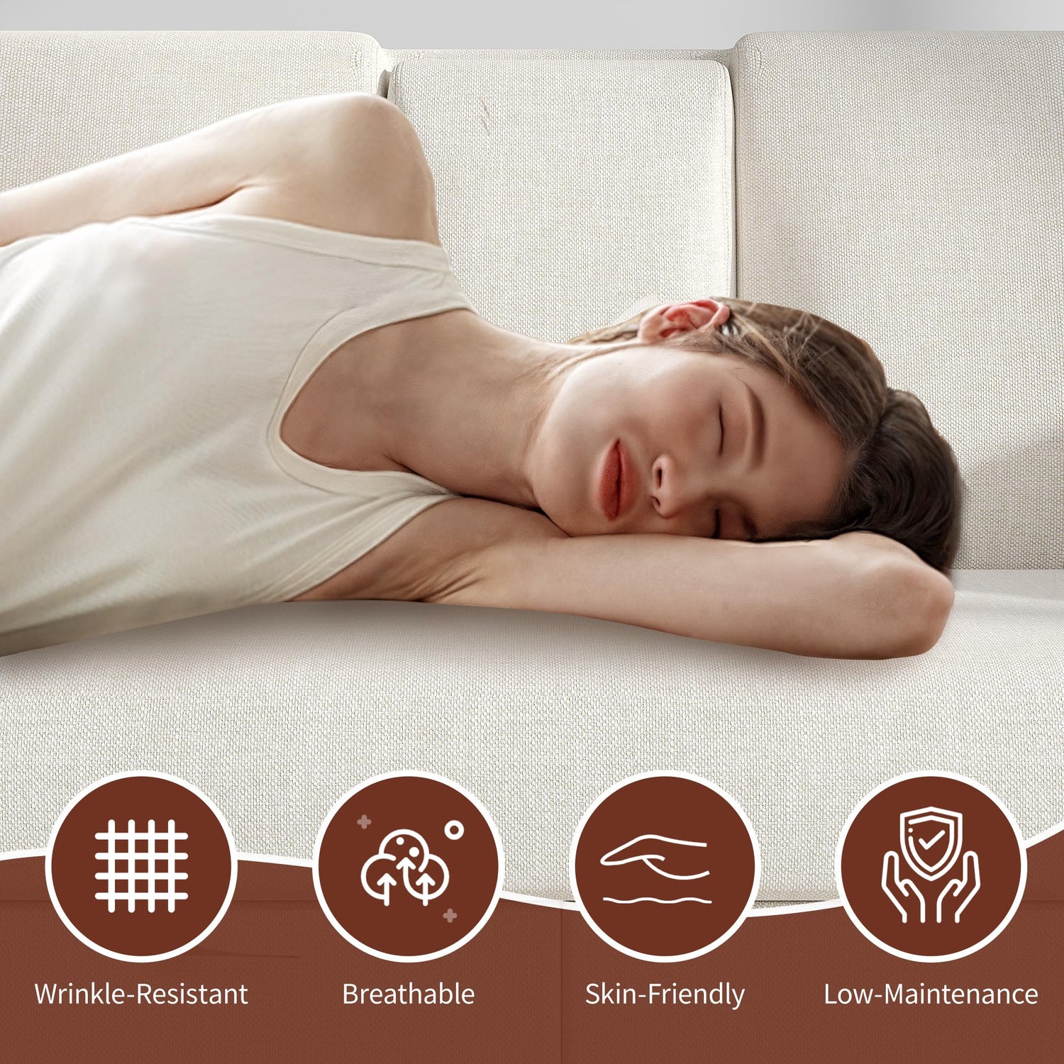- 【Timeless Look】:Our sofa features a classic rectangular silhouette, adorned with modern linen fabric and grey tones, exuding an elegant modern vibe that seamlessly blends with any interior. It is an eternal choice for living rooms, bedrooms, offices, or reception areas. Detachable and washable backrest and cushion covers. The sofa backrest and all cushion covers are detachable, making it easy to disassemble for machine washing and drying, and keeping the sofa clean and hygienic.