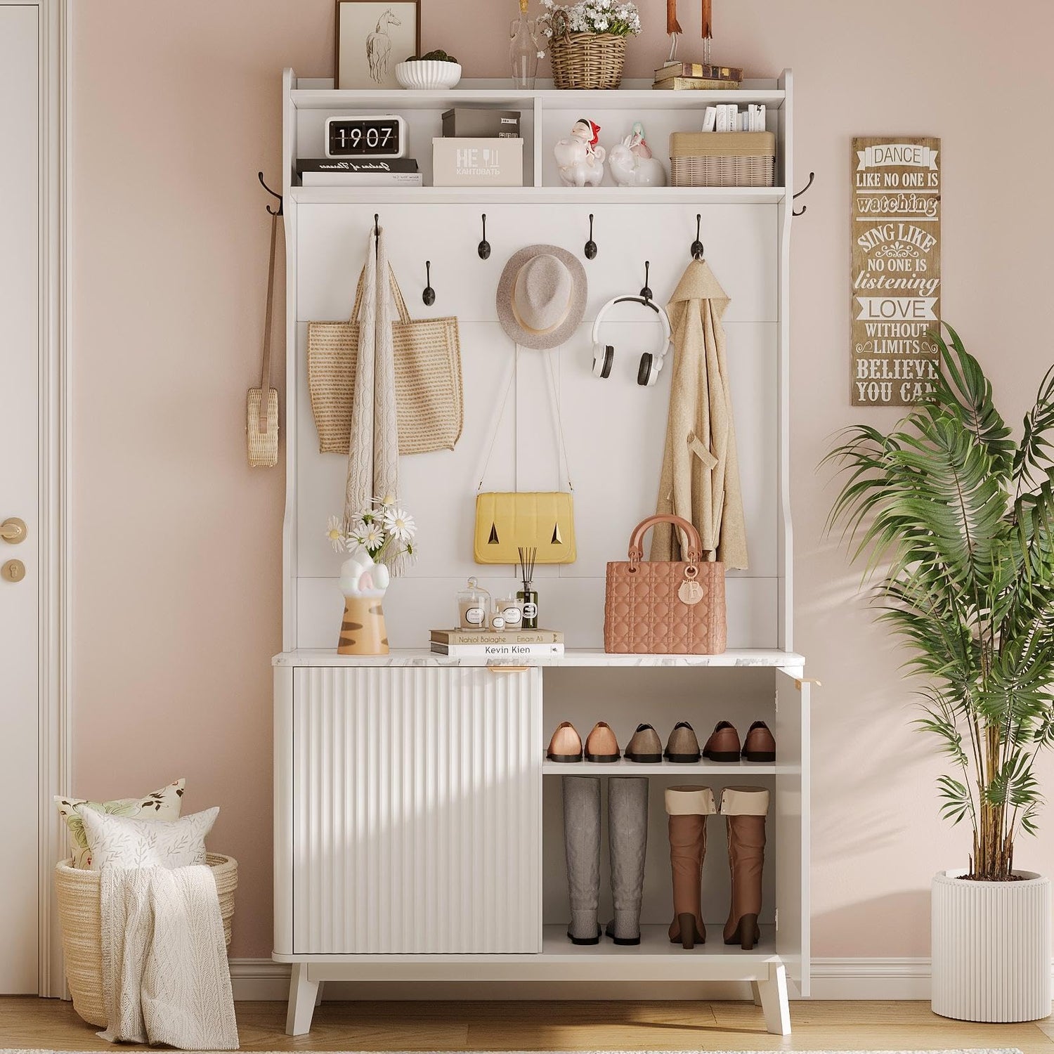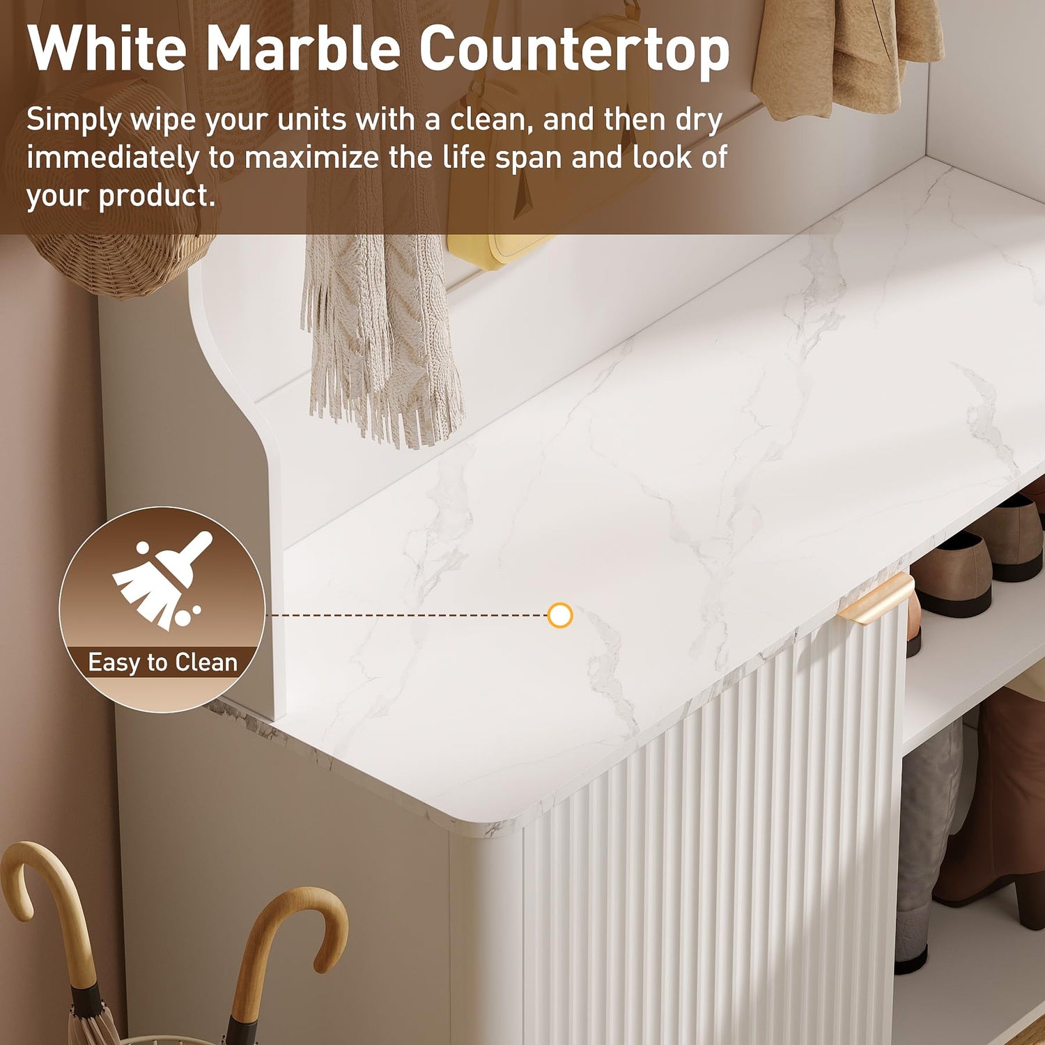 - [ Classic Modern Style ]: The hall tree is simple with a cream white finish, with a stylish blend of wood and metal. The waterproof and stain-resistant faux marble stool surface echoes the stripes on the doors, and the white cabinet doors with hidden gold metal pulls add modern charm to the whole. Whether your decor is traditional or contemporary, it enhances the visual appeal of your space and serves as a standout decorative piece
