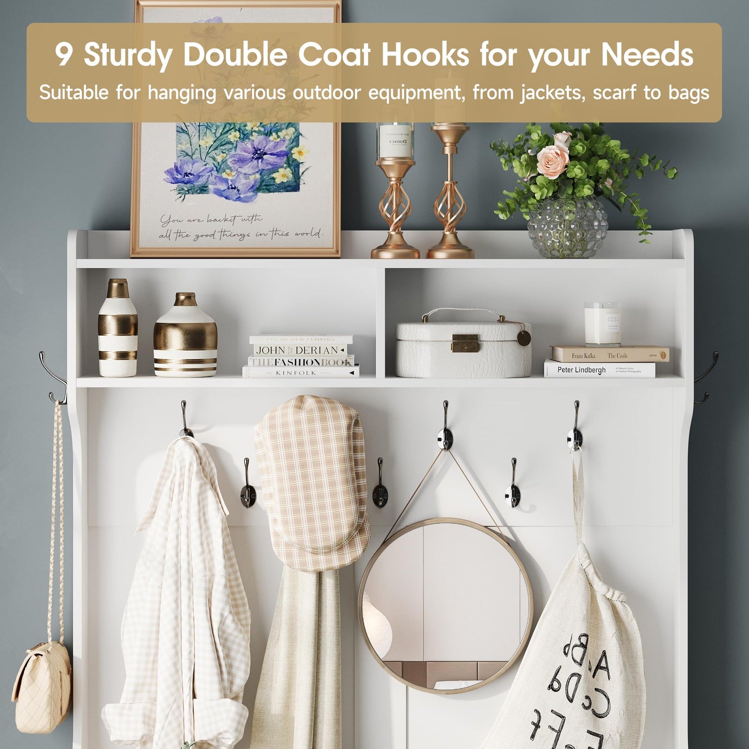 - [ Powerful Storage Space ] This tall hall tree is equipped with 9 sturdy double iron hooks, suitable for hanging various outdoor equipment, from jackets, scarf to bags, from children's toys to pet toys, everything is available. The double opening storage compartments on the top are convenient for storing small items such as photo frames, clocks or other small items such as gloves and keys, keeping essential items in order when going out